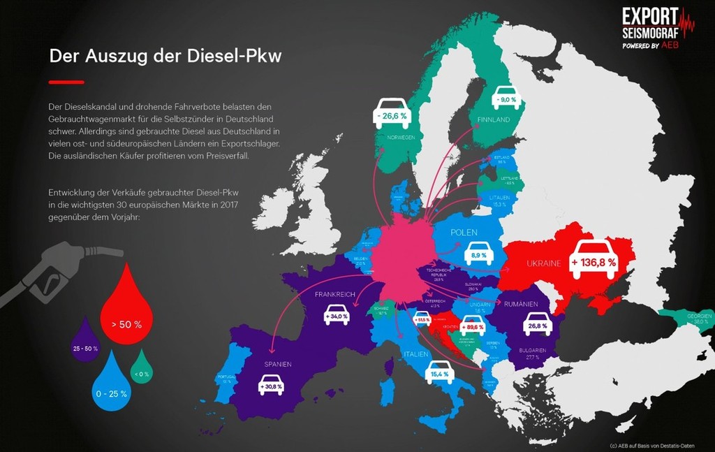 To dokazujejo tudi statistični podatki iz priložene tabele ("Export- / Import-Seismographen (ESD/ISD)", ki jo je že v lanskem juliju predstavilo nemško podjetje AEB (Gesellschaft zur Entwicklung von Branchen-Software) ob sodelovanju z nemškim inštitutom IAL (Institut für Angewandte Logistik). Ob tem so ugotovili, da se je nemški izvoz rabljenih avtomobilov v roku enega leta (julij 2017 – julij 2018) povečal za približno 20 odstotkov (239.541 izvoženih rabljenih avtomobilov). Največ rabljenih vozil so v prej omenjenem obdobju izvozili v Ukrajino (+ 136,8 %), ogromno nemških rabljenih avtomobilov je v tem obdobju pristalo tudi pri naših južnih sosedih (+ 89,6 %) nato sledijo: Avstrija (+ 41,3 %), Francija (+ 34 %), Španija (+ 30,8 %), Slovaška (+ 29 %), Češka (+ 28,9 %) in Romunija (+ 26,8 %). Tudi prebivalci Italije, Poljske, Litve, Belgije in Portugalske niso imuni na ugodne nakupe starejših dizelsko gnanih vozil, drugače pa na takšne avtomobile gledajo v Švici (- 18 %), Georgiji (- 38 %), Finski (- 9 %) ter na Norveškem (- 26,6 %).