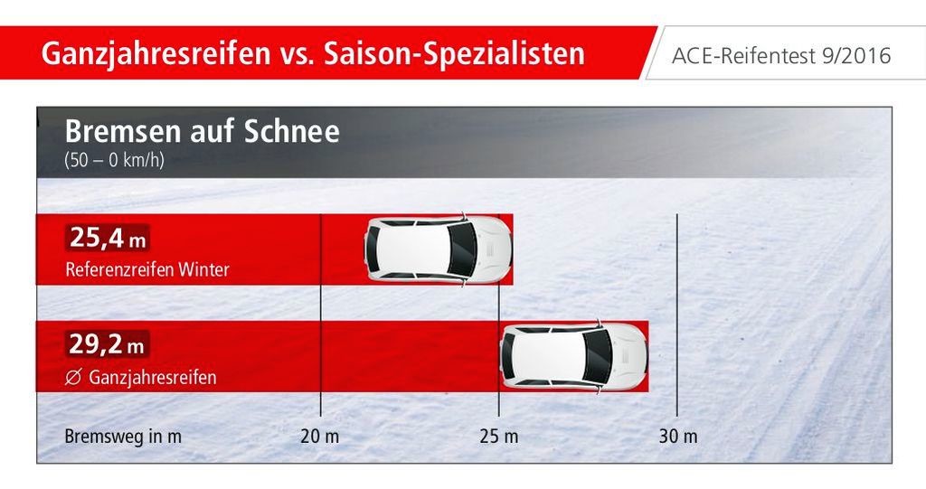 Ob tem se je znova pokazalo, da trenutno ne obstaja celoletna pnevmatika, ki bi uporabnikom ob vožnji po suhi cesti lahko ponudila boljše vozne lastnosti kot odlična letna pnevmatika. Sploh v primeru zaviranja (100-0 km/h). Razlika med njima je ogromna, ker govorimo o približno osem metrov daljši zavorni poti, ki jo bodo poleti deležni uporabniki avtomobila z nameščenimi celoletnimi pnevmatikami. Končna nemška ugotovitev je, da so celoletne pnevmatike primerna alternativa striktno zimskim pnevmatikam, vendar je ob tem vseeno potrebno upoštevati, da ob vožnji po snegu niso boljše od snežnih specialistov, zato jih Nemci priporočajo predvsem ljudem, ki se z avtomobilom ne vozijo prav pogosto ali pa živijo v krajih, kjer sneg ni stalna popotnica obiskovalcev. Poleg tega je ob tem potrebno povedati tudi to, da takšne pnevmatike niso ravno najboljša izbira za ljudi, ki bi radi premagovali cestne razdalje s hitrejšim tempom …