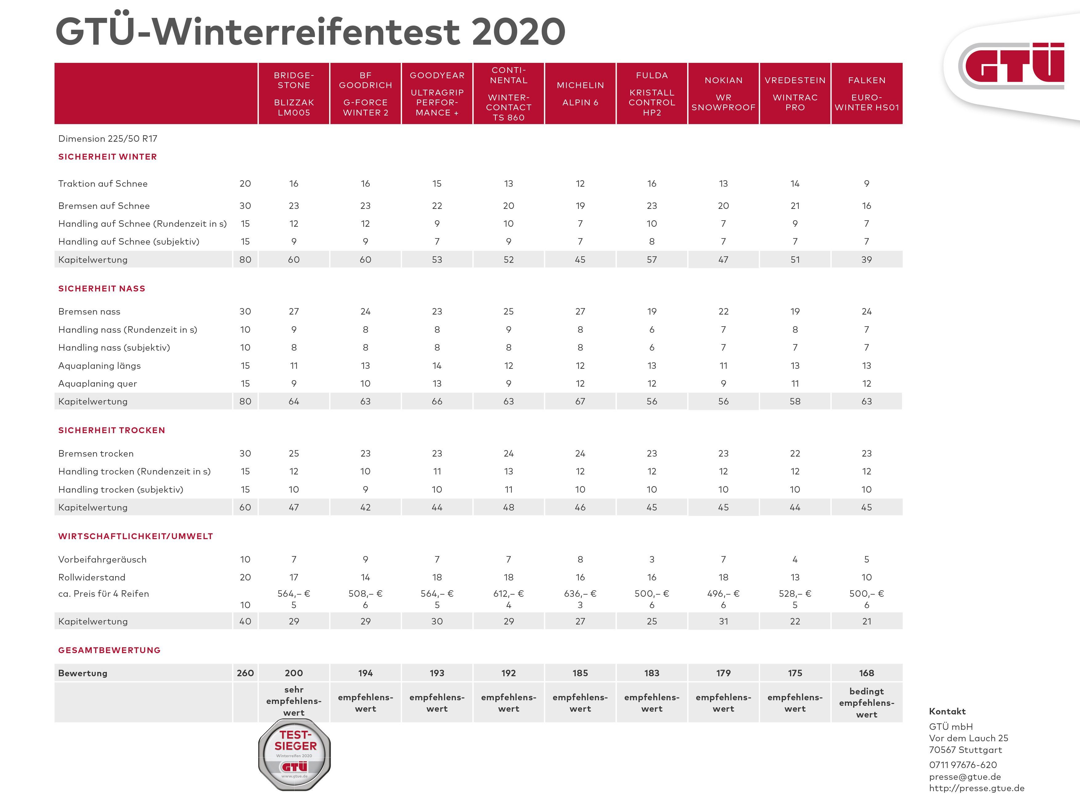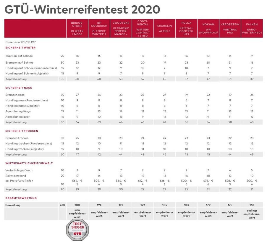 Nemška organizacija GTÜ, avstrijska organizacija ARBÖ in drugi največji nemški avtomobilski klub ACE so včeraj objavili rezultate nedavno opravljenih testov devetih zimskih pnevmatik v dimenzijah 225/50 R17, ki so trenutno že na voljo kupcem v nemških trgovinah.