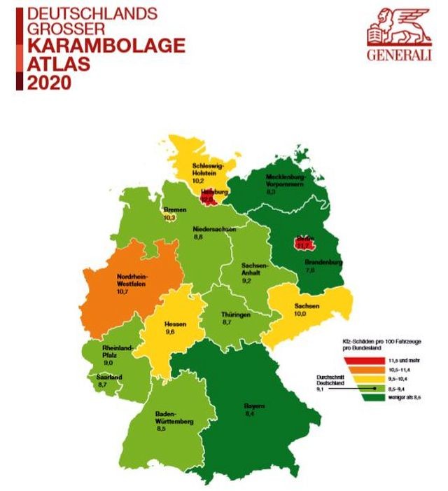 Razkrili so tudi 'konjenice' (od 100 (74 kW) do 150 (110 kW) KM) pod motornimi pokrovi avtomobilov, ki so bili v zadnjih dveh letih največkrat (46 %) udeleženi v prometnih nesrečah na nemških cestah. Največkrat 'poka' v urbanih središčih, v tem pogledu je Hamburg najbolj nevarno mesto, najmanj pa se zaletavajo v nemški zvezni deželi Mecklenburg-Predpomorjanska (Mecklenburg-Vorpommern). Dobili smo tudi odgovor, kdo (po spolu) je boljši voznik, ki je manj zapleten v prometne nesreče. Po mnenju izvedencev zavarovalnice Generali smo moški v tem pogledu samo malenkostno boljši (v prometno nesrečo se zaplete vsak 11. moški) od žensk (vsaka 10. voznica), največkrat pa na nemških cestah 'poka' sredi poletja (junij & Julij), ker vozniki in voznice na cesti takrat niso tako previdni kot ob vožnji v zimskih mesecih, posebej 'ugoden' dan za prometne nesreče pa je ponedeljek, ker se takrat zgodi večina (18,5 %) prometnih nesreč. Ob tem so izničili tudi kliše 'nedeljskih voznikov', ker se statistično gledano zapletejo samo v 8,5 odstotka prometnih nesreč.
