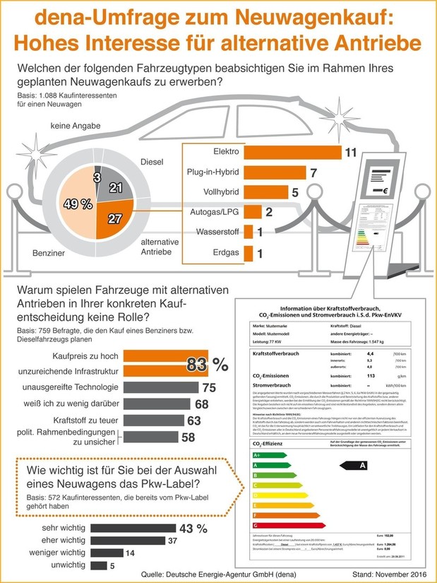 Raziskava, ki jo je za Nemško agencijo za energetiko (Deutschen Energie-Agentur) izvedlo podjetje TNS Emnid, je razkrila da postajajo alternativno gnana vozila čedalje bolj privlačna za kupce novih avtomobilov, ker je skupni delež (27 %) sodelujočih v tej raziskavi, ki bi si v bližnji bodočnosti kupili avtomobil s pogonom na CNG/LPG plin (3 %), vodik (1 %), elektriko (11 %) ali pa hibridno vozilo (12 %), že presegel delež (21 %) morebitnih kupcev novih dizelsko gnanih avtomobilov. Največ vprašanih Nemcev in Nemk (49 %) pa še vedno prisega na nakup novih bencinsko gnanih avtomobilov.