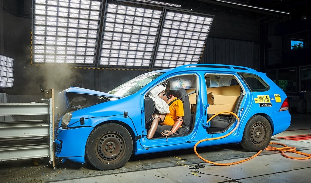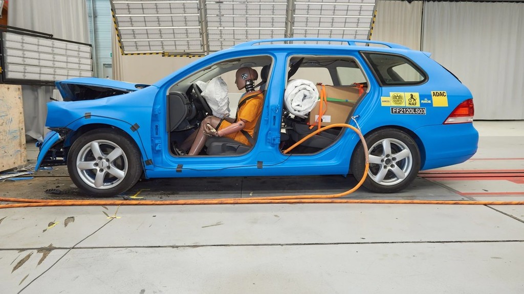 Ja, Nemci so tokrat ob uničevanju dveh avtomobilov (karavanska predstavnika Volkswagnovih golfov iz 5. generacije) upoštevali dva vedenjska vzorca sodobnih potrošnikov, ker so prvega, dodatno obteženega (+ 145 kg) varianta na testnem poligonu poslali v pregrado z nezavarovanim tovorom v prtljažniku, medtem ko so v primeru trka drugega varianta poskrbeli za pravilno zavarovanje tovora, ki so ga 'zasidrali' s pomočjo uporabljenih trakov. Oba čelna trčenja so izvedli pri hitrosti 45 km/h.