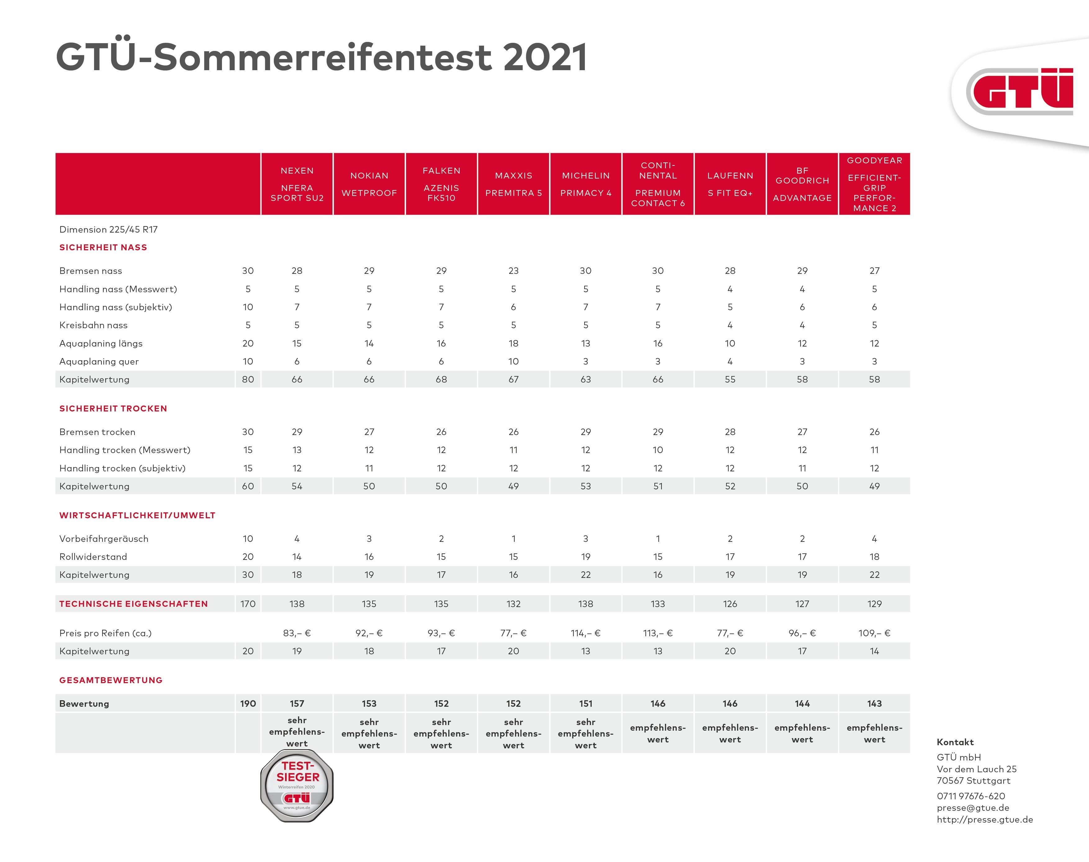 Tokrat so Avstrijci in Nemci vzeli pod drobnogled 9 aktualnih letnih pnevmatik (BF Goodrich Advantage, Continental Premium Contact 6, Falken Azenis FK510, Goodyear EfficientGrip Performance 2, Laufenn S Fit EQ+, Maxxis Premitra 5, Michelin Primacy 4, Nexen N’fera Sport SU2 in Nokian Wetproof) v dimenzijah 225/45 R17 in jim na koncu podelili 5 najboljših možnih ocen ('Sehr empfehlenswert' / zelo priporočljivo) ter 4 ocene 'empfehlenswert' (priporočljivo), ker tokrat za avtomobile iz evropskega C segmenta niso našli nobene resnično slabe letne pnevmatike.