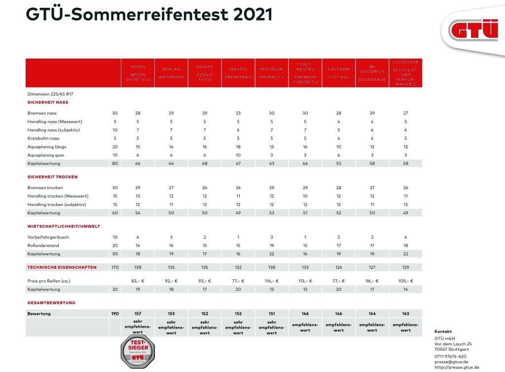Sedaj smo ponovno dobili lep dokaz tega, da oznaka 'premium', s katero so se okitili pri nekaterih proizvajalcih pnevmatik (in nekaterih avtomobilov …), ni garant največje kakovosti, ker smo tokrat dobili presenetljivega zmagovalca v obliki nizkocenovnega gumarskega izdelka znamke Nexen (tip N’fera Sport SU2), ki je drugi najcenejši (nemška prodajna cena za eno pnevmatiko: 83 evrov) tokrat testirani izdelek te vrste. Cenejša od te pnevmatike je samo letna pnevmatika znamke Maxxis (tip Premitra 5) s prodajno ceno v območju 77 evrov (nemška prodajna cena za eno pnevmatiko). Na odlično drugo mesto se je uvrstila nekoliko dražja pnevmatika znamke Nokian (tip Wetproof / 92 evrov), tretje mesto si delita dve enako ocenjeni (skupni seštevek) pnevmatiki (Maxxis Premitra 5 (77 evrov) in Falken Azenis FK510 (93 evrov)).