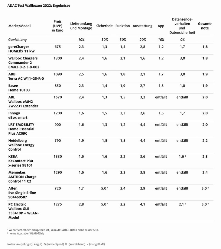 Veliko bolj kritični so bili Nemci na področju varnosti za uporabnike, ker so pri dveh testnih kandidatih (PC Electric Wallbox GLB 353419P + WLAN (nemška prodajna cena: 1275 evrov) in Alfen Eve Single S-line 90446058 (720 evrov)) ugotovili, da uporabniku ne ponujata dovolj zaščite pred možnim električnim udarom, ker se je zaščita vklopila prepozno, odnosno se pri dveh izmed treh izvedenih polnjenj sploh ni vklopila. Zato sta ta dva izdelka, ki se jima morajo pametni kupci izogniti, prejela najslabšo možno oceno „mangelhaft“ (pomanjkljivo). Oba zmagovalca tega testa (go-eCharger HOMEfix 11 kW in Wallbox Chargers Commander 2) sta prepričala Nemce z najbolj uporabnim 'paketom' (odlične ocene za uporabnost in varnost uporabnikov ter uporabnikom prijazno upravljanje funkcij ob pomoči aplikacij).