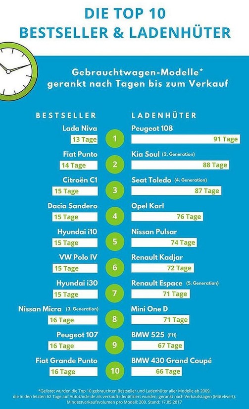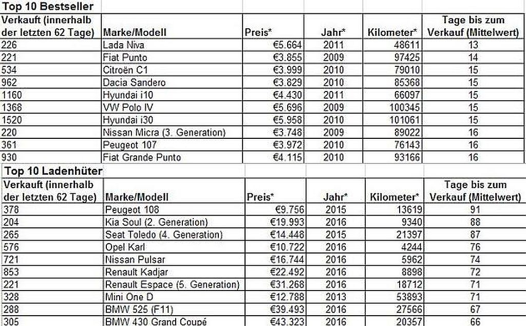 Med zmagovalci je tudi Fiatov punto, ki zamenja lastnika že v povprečnih štirinajstih dneh, na tretjem mestu pa najdemo malčka (model C1) znamke Citroën. Med ostalimi zmagovalci na tej lestvici najdemo predvsem rabljene predstavnike evropskih segmentov A (mini) in B (supermini). Bolj zanimiva je lestvica štirikolesnih poražencev, ki jih v bistvu noče noben kupec, vsaj ne za takšno ceno. Ob tem je zanimiva usoda peugeota 108. Čeprav je ta avtomobil v bistvu enak kot citroën C1, se bo prodajal občutno dlje (povprečnih 91 dni). S tem mu je pripadla tudi nehvaležna vloga najbolje uvrščenega avtomobila na lestvici 'najslabših'. Podobno slab ugled pri nemških kupcih rabljenih avtomobilov ima tudi modna kia soul 2. generacije (88 dni) ter 'španski audi A4' (seat toledo 4. generacije, 87 dni).