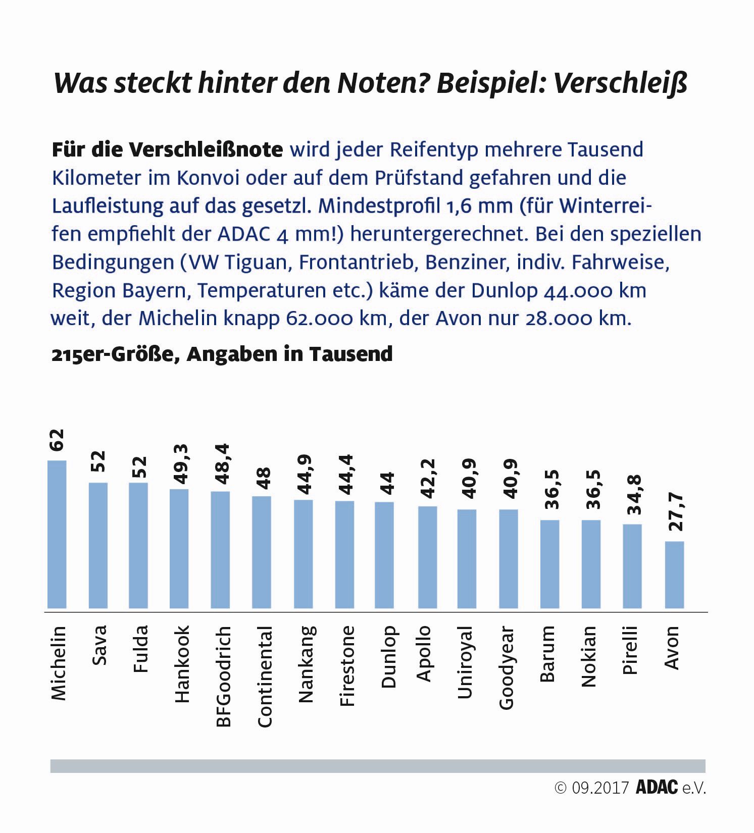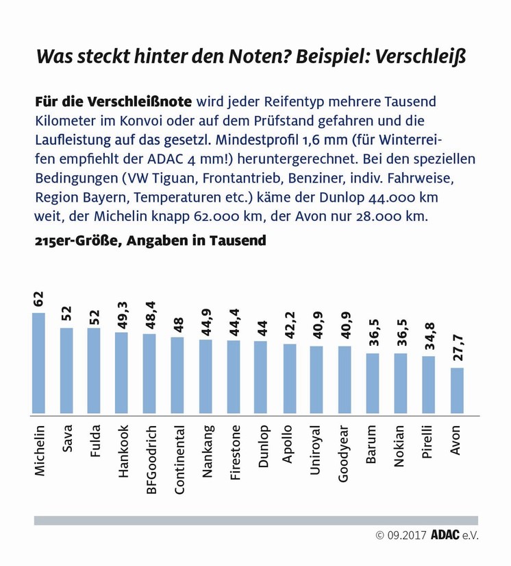 Tabela, ki razkriva povprečno porabo goriva, je povezana z meritvami, opravljenimi ob vožnji Volkswagnovega tiguana. Sedaj že vemo, da ima teža avtomobila odločilen vpliv tudi na obrabo pnevmatik (podobno velja tudi za motorni navor, več ko ga imate na zalogi, hitreje boste 'skurili' pnevmatike, po tej lastnosti so znani predvsem 'traktorji' (vozila z vgrajenimi dizelskimi motorji)), dodatne razlike v zgradbi in sestavi pnevmatik pa na vsakih 100 prevoženih kilometrov lahko prinesejo razlike v količini (približno pol litra goriva) porabljenega pogonskega goriva. Povsem različna pa je tudi dolgoživost pnevmatik. S pnevmatikami znamke Avon boste v povprečju prevozili približno 28.000 kilometrov, medtem ko boste s podobno pnevmatiko znamke Michelin prevozili še enkrat večjo razdaljo (približno 62.000 km). Zato ob nakupu pretehtajte vse razloge in potrebe, ne nasedajte na premium provokacije (ni vse zlato kar se sveti …) in na koncu izberite pnevmatiko, ki najbolje ustreza vašim potrebam.