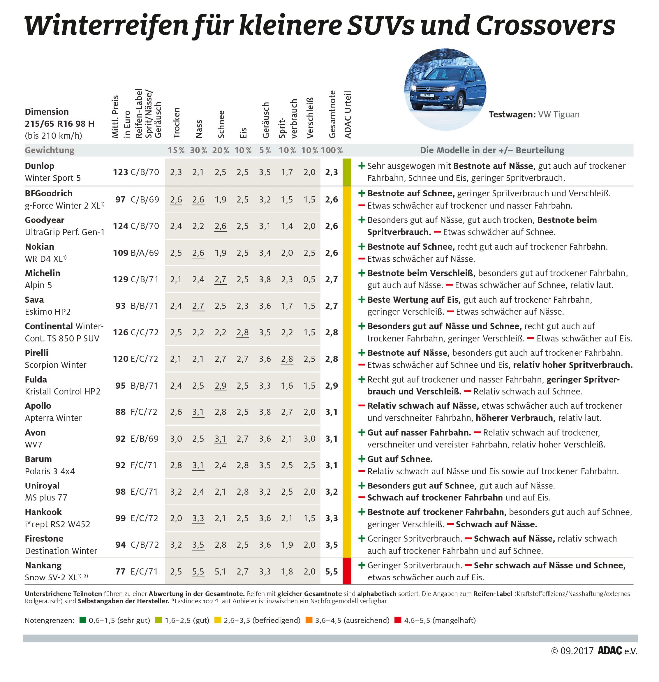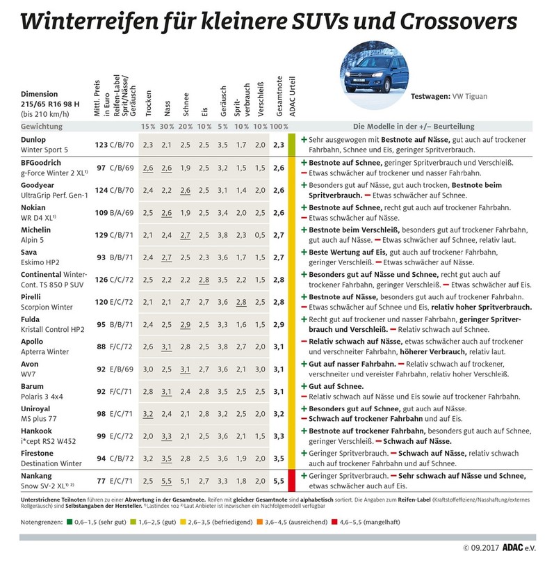 Na tem testu so testirali tudi dve pnevmatiki znamke Sava. Prva, ki so jo nadeli na Volkswagnovega golfa se je tokrat uvrstila na rep razpredelnice, za njo je uvrščena najslabša tokrat testirana pnevmatika znamke, ki je imela v Jugoslaviji mitičen status (podobno kot vsi ostali tedanji gumarski izdelki iz Zahodne Evrope). Govorimo o pnevmatiki znamke Semperit (model Master-Grip 2, 63 evrov), ki je odlična samo ob vožnji po snegu. V tej disciplini blesti tudi pnevmatika znamke Sava (model Eskimo S3+, 60 evrov), ki ne mara suhih zimskih cestah, preveč pa ji ne diši niti vožnjo po mokrem. Na tem velikem primerjalnem testu so Nemci testirali tudi zimske pnevmatike za bolj 'športno obilna' SUV ('Senioren und Veteranen-Auto') vozila in oblikovne križance (crossover) v dimenzijah 215/65 R16, ki so jih v tem primeru namestili na 'kompaktnega' modnega tiguana. Na tem testu je zmagala pnevmatika znamke Dunlop (model Winter Sport 5 SUV, 123 evrov), ki je zmagala tudi na podobnem letošnjem GTÜ, ACE in ARBÖ testu. To je tudi edina izmed vseh tokrat ocenjenih SUV zimskih pnevmatik, ki si je zaslužila najboljšo možno oceno „sehr empfehlenswert“ (zelo priporočljivo).