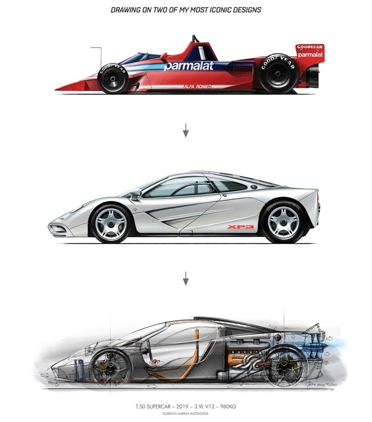 Murray pravi, da bo ta avtomobil utelešal vse njegove pridobljene izkušnje na področju konstruiranja športnih avtomobilov, zato je ob tem omenil dva legendarna 'športna aparata', ker sta prispevala nekaj karakteristik, ki bodo definitivno zaznamovale model T.50 (dolžina: 4.380 mm, širina: 1.850 mm). Kot prvega je omenil legendarno tekmovalno (formula 1) 'Brabham Alfo' (brabham BT46B) iz leta 1978, ki se je med drugim lahko pohvalila tudi z vgrajenim električnim ventilatorjem na zadku, drug pomembni avtomobil, ki je pomembno vplival na razvoj modela T.50 nosi oznako mclaren F1 (1992 - 1998). Posledično se bo tudi model T.50 lahko pohvalil s 3-sedežno 'Fighter-Jet' zasnovo potniške kabine, ki jo je v svet avtomobilizma leta 1966 vpeljala znamka Ferrari s kupe modelom 365 P 'Berlinetta Speciale' (samo 2 izdelana primerka), najbrž pa bodo povzeli tudi zasnovo odpiranja bočnih vrat, ki jo je s tekmovalnim modelom 'Tipo 33 Stradale Prototipo' leta 1967 kot prva predstavila znamka Alfa Romeo (ja, pri znamki Lamborghini so v tem pogledu pač plagiatorji, podobno kot znamka Mercedes-Benz z modeloma CLS/CLA v pogledu 'štirivratnih kupejev', ki so v resnici marketinški izum znamke Rover (4-vratni model P5 coupé, 1962-1973), ki ga do leta 2004 v avtomobilski industriji ni posnemal prav nihče …).