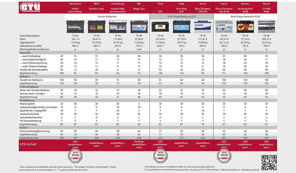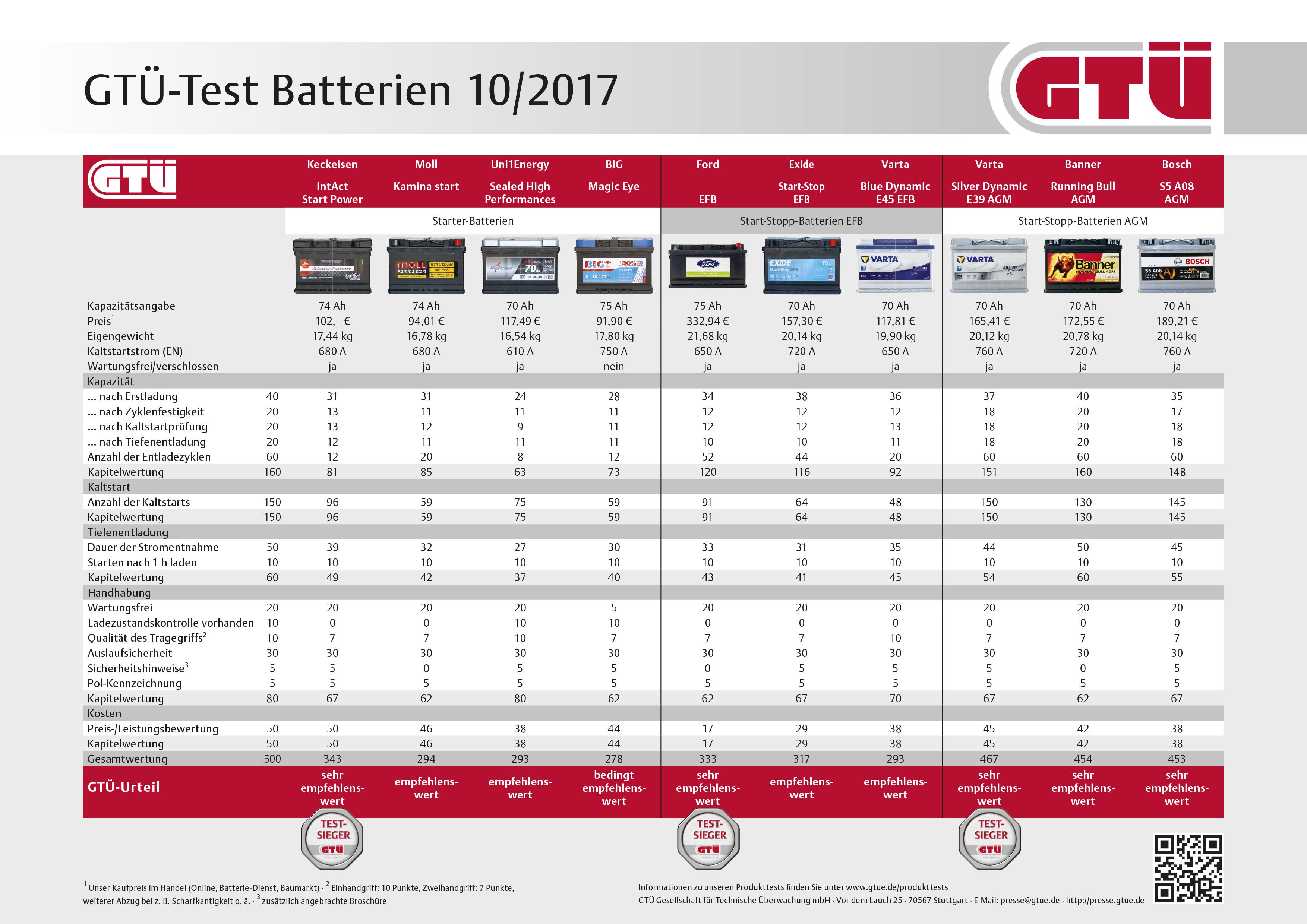 Neodvisna nemška strokovna organizacija GTÜ (Gesellschaft für Technische Überwachung mbH), ki deluje predvsem v interesu nemških potrošnikov, je v teh dneh objavila rezultate nedavno opravljenih laboratorijskih testiranj desetih avtomobilskih akumulatorjev, ki so trenutno na voljo v nemških trgovinah.