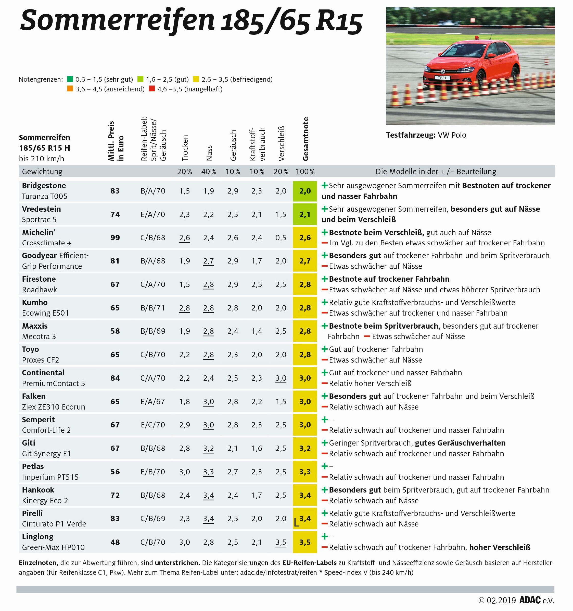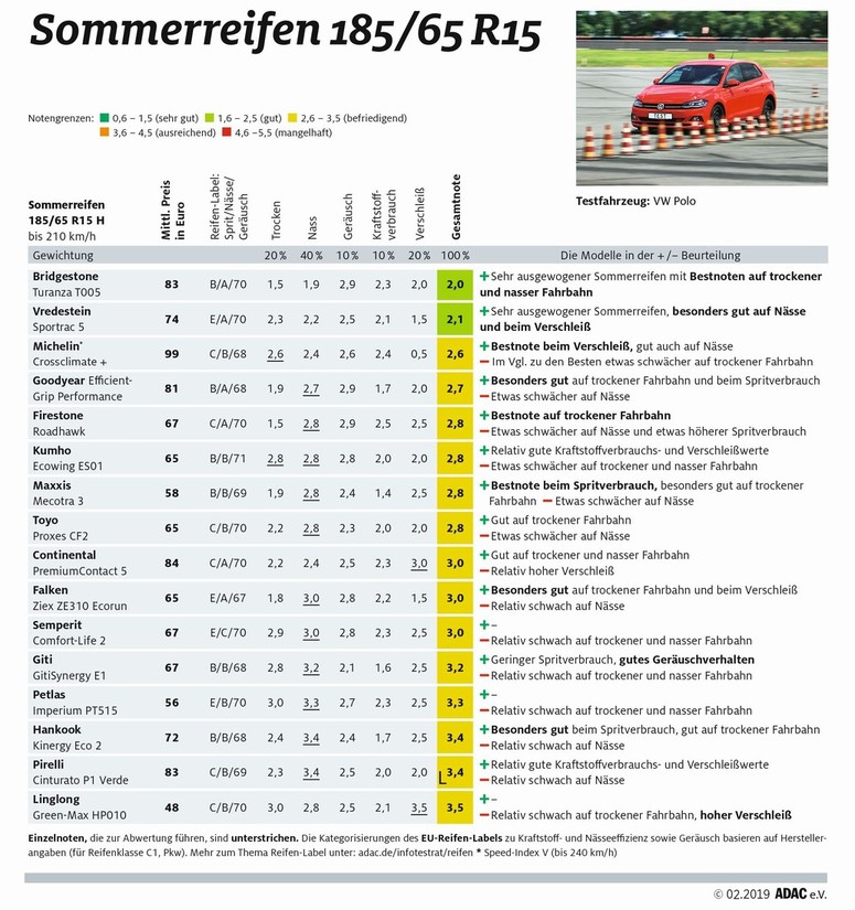 Rezultati testiranj 16. letnih pnevmatik (dimenzije: 185/65 R15) za kompaktne avtomobile ('supermini') so pokazali, da v tej kategoriji ni več zelo slabih pnevmatik, ker je večina (14 letnih pnevmatik) testiranih pnevmatik tokrat prejela oceno „befriedigend“ (zadovoljujoče), samo dve pnevmatiki pa sta prejeli oceno „gut“ (dobro). Najbolje tokrat ocenjena letna pnevmatika (izdelek znamke Bridgestone) v tej kategoriji je blestela ob vožnji po suhi in mokri vozni podlagi, očitajo ji edino nekoliko večjo glasnost. Podobno je ocenjena tudi druga najbolje uvrščena letna pnevmatika znamke Vredestein, ki je resnično blestela predvsem ob vožnji po mokrem ter na področju dolgoživosti (majhna obraba tekalne površine).