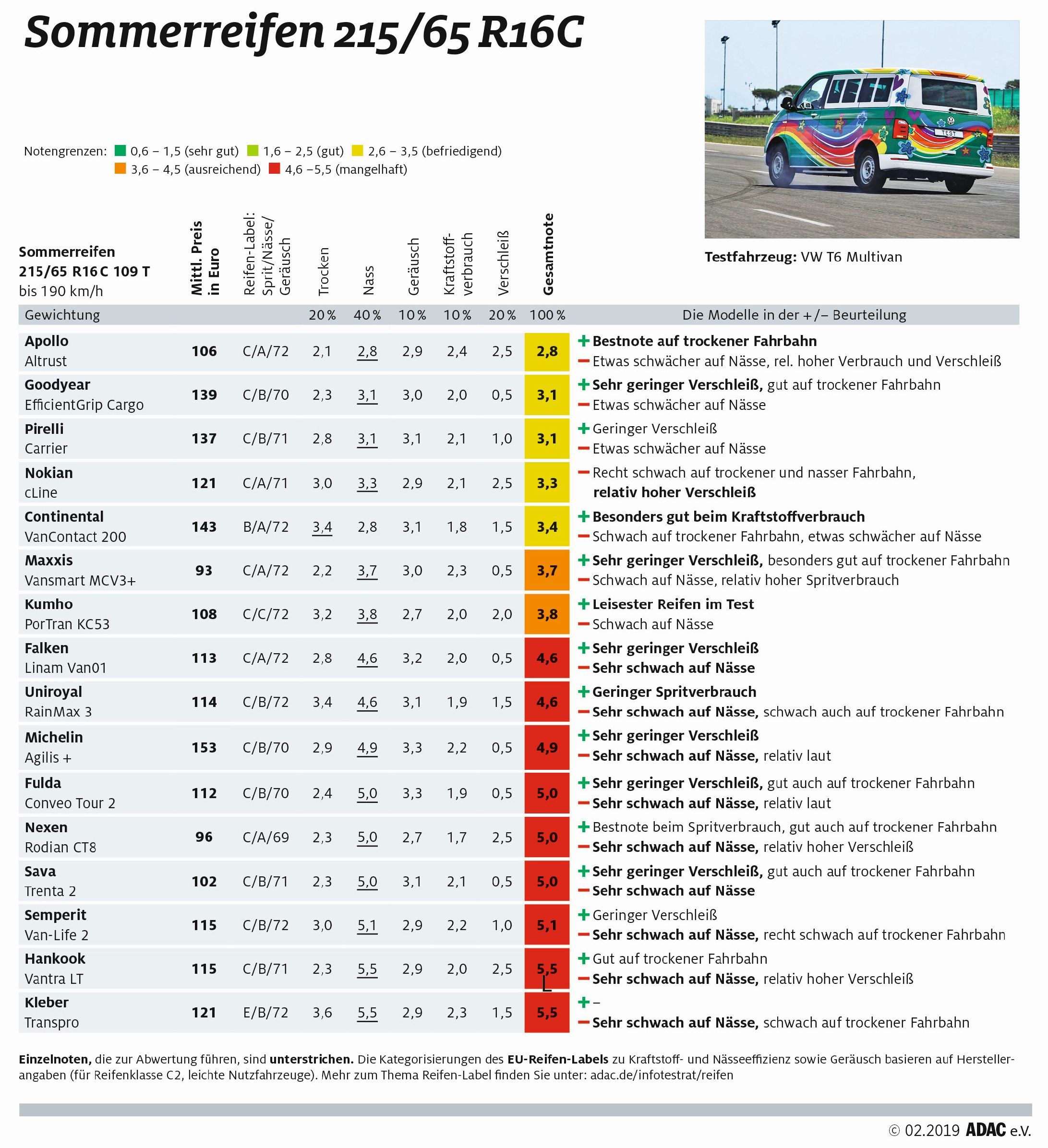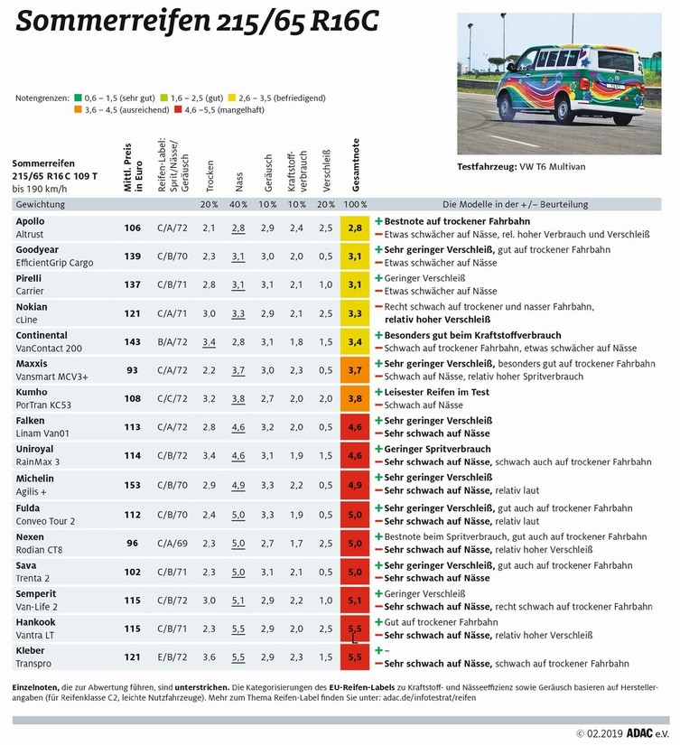 Če bi 5 tokrat ocenjenih pnevmatik (izdelki znamk Apollo, Goodyear, Pirelli, Nokian in Continental) za lahka gospodarska vozila, ki so dobile samo srednjo možno oceno zadovoljujoče, opredelili kot prave zmagovalke tega testa, bi bila to zelo slaba šala, ker so ob primerjavi z letnimi pnevmatikami za osebna vozila občutno slabše v vseh testnih kriterijih. Izdelka znamk Apollo in Goodyear se obneseta predvsem ob vožnji po suhem, imata pa težave ob vožnji po mokrem. Izdelek znamke Apollo so Nemci okrcali tudi zaradi 'kratkega življenja', ki predstavlja posledico prehitre obrabe. Na tem področju pa blesti predvsem izdelek naše znamke Sava, ker je Savina pnevmatika (model Trenta 2) skoraj neuničljiva (pripisujejo ji približno 81.000 prevoženih kilometrov). Podobno kot ob primerjavi pnevmatik znamk Apollo in Goodyear je izpadla tudi primerjava ostalih izdelkov znamk Pirelli, Nokian in Continental. Tudi dve pnevmatiki (Maxxis in Kumho), ki sta dobili malenkostno slabšo oceno „ausreichend“ (zadostno) imata težave ob vožnji po mokri vozni podlagi, vse težave takšnih tovornih pnevmatik ob vožnji po mokrem pa zelo dobro demonstrira priložena tabela z rezultati (dolžina zavorne poti) ob zaviranju pri samo 80 km/h.