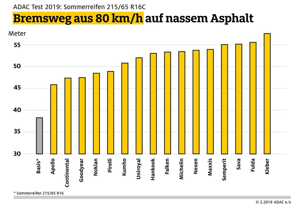 Zaradi dejstva, ki pravi, da se boste z enako dimenzioniranimi pnevmatikami za osebna vozila v enakih pogojih ustavili občutno hitreje (za to boste potrebovali približno 10 metrov manj prostora), Nemci predlagajo uporabnikom lahkih gospodarskih vozil, da naj v priročnikih za njihova vozila preverijo možnost namestitve pnevmatik za osebna vozila, sploh v primerih, ko imajo takšne pnevmatike zadostno nosilnost. Razlika ob zaviranju na mokri podlagi bo dobro vidna (37 metrov v primeru pnevmatik za osebna vozila in najmanj 47 metrov v primeru pnevmatik za lahka gospodarska vozila). V primeru pnevmatik znamk Semperit, Sava, Fulda in Kleber pa boste potrebovali še nekaj dodatnih metrov (od 55 do 60 metrov zavorne poti v primeru izdelka znamke Kleber). In to pri relativno počasnih 80 km/h …