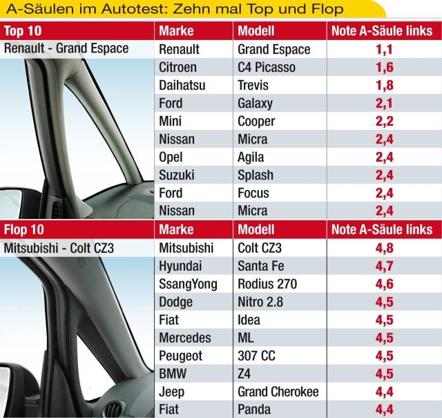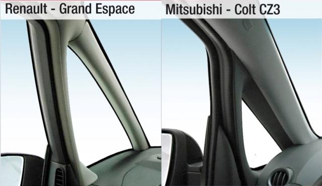 Nemški strokovnjaki so pri svojem ocenjevanju uporabili številčno lestvico z razponom od 0,6 (najboljša možna ocena) do 5,5 (najslabša možna ocena) in ugotovili, da ima lastnik aktualnega Renaultovega enoprostorca (espace) med vsemi testiranimi vozili najboljši pregled med vožnjo skozi križišča ter še posebej pri vožnji skozi ovinek, ki poteka v levo. V tej disciplini pa ne blesti Mitsubishijev colt, ki si je zaradi odebeljenega sprednjega para A-stebričkov prislužil najslabšo oceno na tem