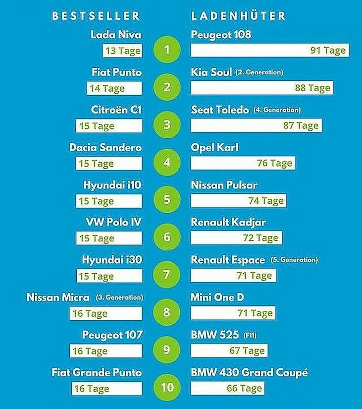 Kot kriterij pri ocenjevanju so uporabili hišno bazo podatkov o avtomobilih, ki niso starejši od letnika 2009, poleg tega je moral vsak rabljen avtomobil ob želji po uvrstitvi na to lestvico izpolnjevati tudi določen kriterij (najmanj dvesto mesečnih menjav lastništva modela na portalu Autouncle). Objavili so tudi neslavni seznam rabljenih avtomobilov, ki so v Nemčiji okrašeni z oznako 'Ladenhüter' (ljudsko ime za vozilo, ki ga je skoraj nemogoče prodati …). Začnimo s tistimi, ki med nepriljubljenimi najhitreje najdejo nove lastnike. Tako na zadnjem mestu lestvice najdemo prestižno bavarsko vozilo z oznako 430 gran coupe (66 dni) v družbi še enega Bavarca (BMW 525 (F11) - 67 dni) in še enega sorodnika (mini one D - 71 dni). Podobno dolgo na nove lastnike čakata tudi dva velika renaulta (espace (V generacija): 71 dni / kadjar: 72 dni). Med najmanj priljubljenimi se je znašel tudi nissan pulsar (74 dni), ki pa bo vseeno hitreje našel lastnika kot mali opel karl (76 dni). Še dlje (87 dni) bo na novega lastnika čakal seat toledo (4 generacija), podobno je tudi s kio soul (II generacija - 88 dni). Najdlje pa na novega lastnika čaka peugeot 108 (91 dni).