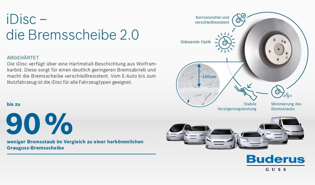 Zato je za lastnike avtomobilov in tudi za ekologe zelo razveseljiva novica, ki prihaja iz nemškega podjetja Buderus Guss, kjer v enem letu proizvodnje izdelajo približno 20 milijonov novih zavornih diskov. Za nastanek te novice je krivo predvsem spoznanje, da izpuhi škodljivih emisij za okolje, ki nastanejo ob delovanju motorjev s fosilnimi gorivi, niso edini krivec za povečano onesnaževanje ozračja, soliden delež pri tem (približno 33 odstotkov) ima tudi zavorni prah, ki predstavlja posledico obrabe zavornih ploščic in diskov. Zato so se Nemci pred časom lotili razvoja in izdelave resnično revolucionarnega zavornega diska z imenom iDisc ('i' simbolizira inovacijo), ker ob zaviranju ob pomoči takšnega diska nastane do 90 odstotkov manj zavornega prahu. Posledično bodo lepša (manj umazana) tudi platišča na avtomobilih s kolutnimi zavorami.