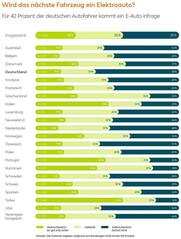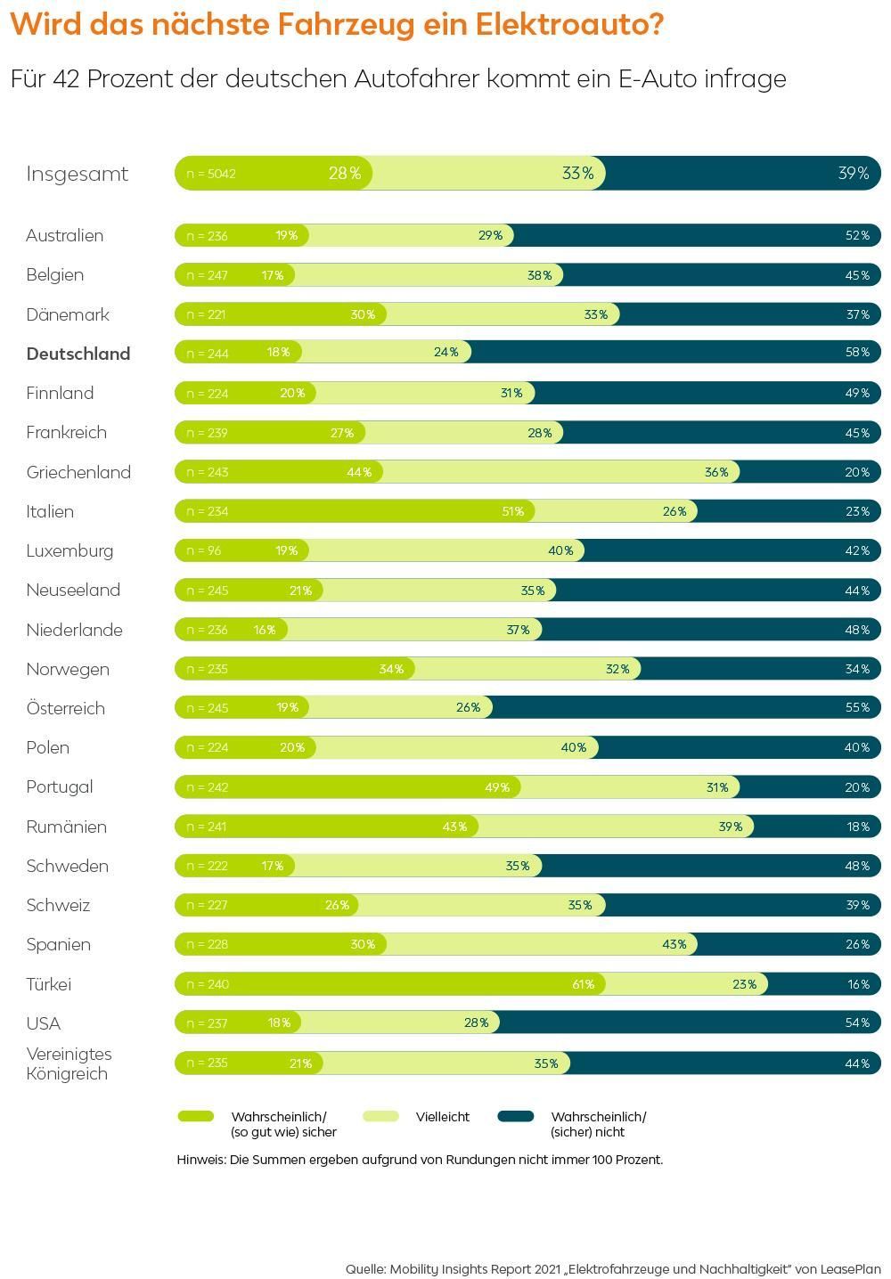 V letošnjem februarju objavljena študija z naslovom "Elektrofahrzeuge und Nachhaltigkeit" (električna vozila in trajnost), kjer je na vprašanja družbe LeasePlan odgovarjalo več kot 5000 polnoletnih Evropejcev iz 22. evropskih držav, je razkrila, da večino potencialnih kupcev električnih avtomobilov še vedno motijo previsoke prodajne cene (53 % izmed vseh vprašanih nemških državljanov) takšnih vozil in pa prekratek akcijski radij (50,2 %) s samo enim polnjenjem akumulatorjev. Navzlic takšnemu razmišljanju bi se ta trenutek za nakup novega striktno električno gnanega avtomobila odločilo približno 61 odstotkov izmed vseh vprašanih (22 držav), odnosno 42 % vprašanih Nemcev in Nemk.