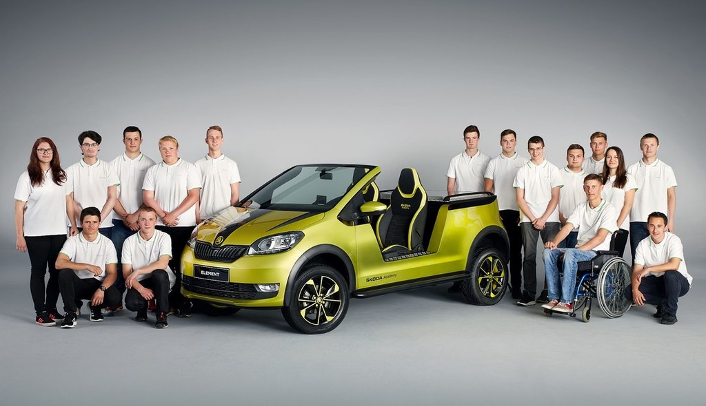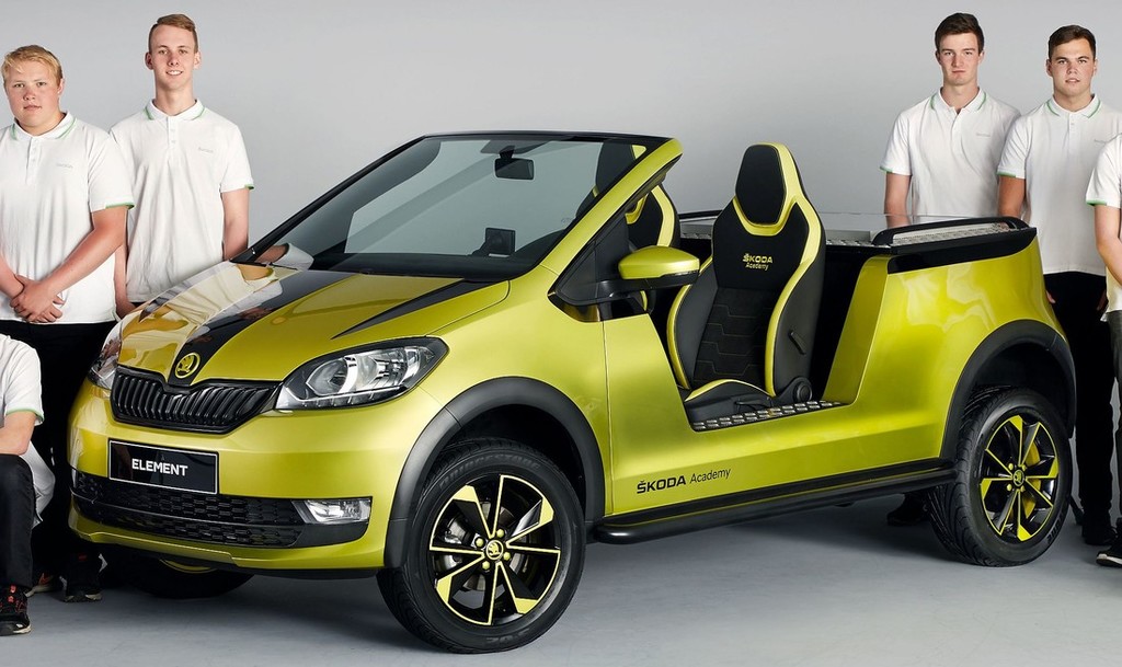 Izmed približno 900 učencev in učenk Škodinega šolskega centra se zadnjih nekaj let vedno najde peščica 17- in 18-letnih vajencev in vajenk, ki jih pritegne interni projekt izdelave prototipnega avtomobila. Sedanji, že četrti projekt s polnim imenom 'Azubi Car 2017', so Čehi sprožili v lanskem oktobru, ko so mladi oblikovalci ustvarili prve idejne skice novega Škodinega prototipa, ki se tokrat ukvarja s tematiko vozil za šport in prosti čas. Tako smo dobili prototipno škodo element, kompaktno in striktno električno gnano vozilo v stilu klasičnih poletnih vozil za obisk plaž in transport pomembnih gostov, ki so jih na začetku izdelovali predvsem za lastnike razkošnih plovil.