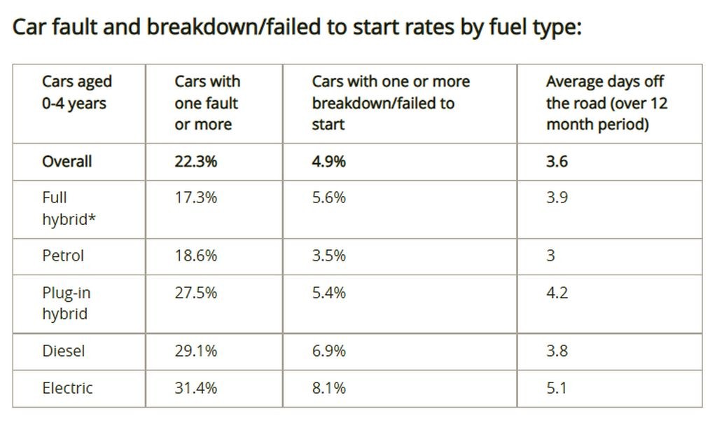 Na splošno so z rezultati te raziskave lahko najbolj zadovoljni lastniki bencinsko gnanih (18,6 % izmed vseh, ki so sodelovali v anketi, je potrdilo prisotnost okvar …) in hibridnih (17,3 %) avtomobilov, medtem ko se lastniki priključnih hibridov (27,5 %) in dizelsko gnanih (29,1 %) vozil lahko pohvalijo s podobno klavrno, samo malenkostno večjo zanesljivostjo delovanja avtomobilov kot pa lastniki striktno električno gnanih (31,4 %) avtomobilov.