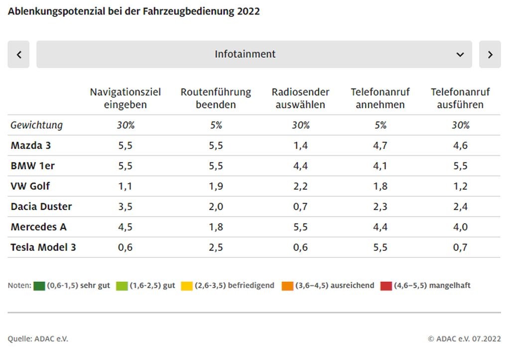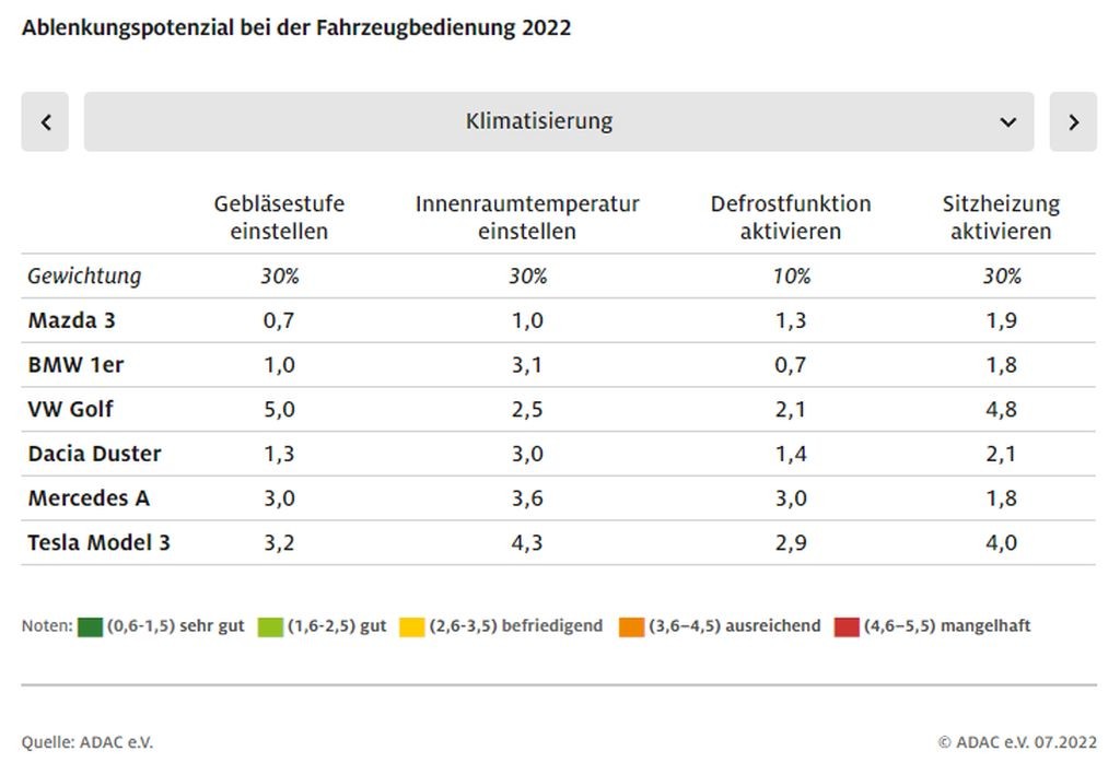 Na tem primerjalnem testu šestih priljubljenih modelov avtomobilov (BMW serije 1, mazda 3, mercedes-benz razreda A, dacia duster, tesla model 3 in volkswagen golf), ki so ga v klubu ADAC izvedli ob sodelovanju s strokovnjaki iz Univerze Augsburg, je sodelovalo 24 ljudi, ki pred tem niso imeli izkušenj z upravljanjem testnih vozil. Po krajši spoznavni fazi so jih poslali na testni poligon, kjer so morali med vožnjo s hitrostjo od 40 do 50 km/h vklapljati nekatere varnostno relevantne funkcije (vklop in nastavitev hitrosti delovanja brisalcev, vklop pozicijskih in kratkih luči, odnosno dnevnih prednjih luči in meglenk, vklop varnostnih utripalk …) in nekatere varnostno nepomembne funkcije (vklop ogrevanja sedežev, vklop, odnosno nastavitev delovanja klimatske naprave, vnos želene destinacije v navigacijski sistem, izbira in nastavitev parametrov za poslušanje glasbe in uporaba komunikacijskih sredstev …), povezane predvsem z udobjem potnikov.