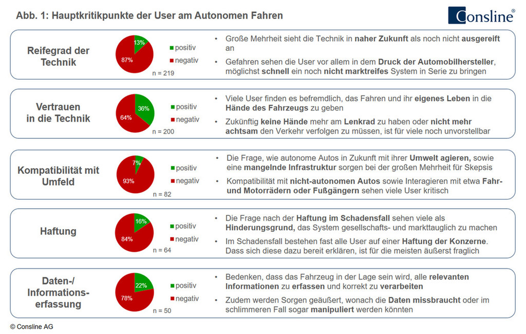 Pri nemškem svetovalnem podjetju Consline AG so v teh dneh predstavili izsledke študije glede sprejemljivosti avtonomno delujočih vozil med nemško populacijo, ki se nekoliko razlikuje od ostalih študij, ker ni izvedena ob uporabi telefonov, temveč komentarjev in izjav na nemškem spletu.