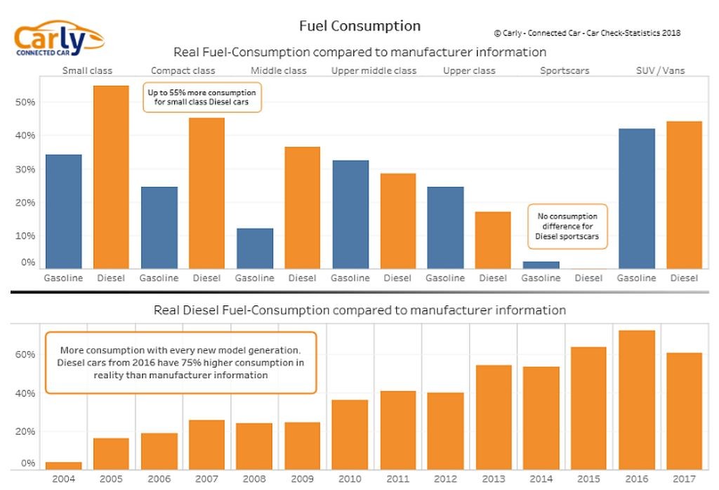 Podobno tezo o pravljicah iz sveta marketinga, kjer ves čas pridno razmišljajo, kako bi kupce prepeljali čez vodo, vendar bi jih ob tem seveda pustili žejne, zagovarja tudi poročilo podjetja Carly, ker pri nekaterih avtomobilih ugotavlja prav neverjetna odstopanja v območju od 55 do 75 odstotkov. Ob tem so razkrili še eno zanimivo podrobnost, ker je bilo v dobrih starih časih (recimo leta 2004) takšnega zavajanja s strani proizvajalcev precej manj. Takratne uradne navedbe glede povprečne porabe goriv so v povprečju odstopale samo za približno 5 odstotkov, v današnjih časih pa Nemci omenjajo povprečno 74 odstotno odstopanje od uradno navedenih številk. Za to je zaslužna predvsem sprememba filozofije pri kupcih, ker si želijo imeti v vozilih čedalje več komfortne opreme v obliki različnih električno gnanih naprav, ki pa seveda ne delujejo zastonj. Po mnenju združenja nemških veteranov so 'normalne avtomobile' (avtomobili z relativno nizko stopnjo vgrajene komfortne in motorne elektronike) nehali izdelovati že leta 2005, poleg tega leta 2004 na cestah še ni bilo toliko avtomobilov iz danes izredno priljubljene kategorije SUV vozil in oblikovnih križancev, ki so nesporni prvaki v zapravljanju pogonskega goriva po nepotrebnem (univerzalna formula glede povečane porabe goriva: + 25 %), ker so težji in višji (slaba aerodinamika) od donatorjev tehnoloških platform.