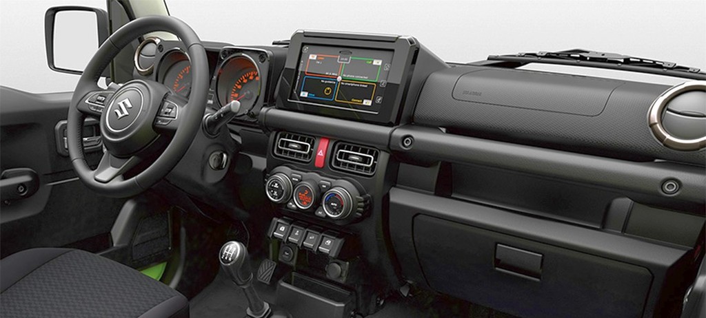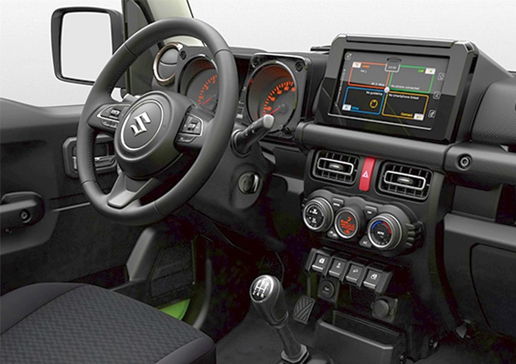 Podobno klasično odmerjene oblikovne smernice so japonski oblikovalci uporabili tudi pri oblikovanju armaturne plošče, ki ostaja zelo praktično orientirana (nekoliko manj vgrajenih stikal in gumbov, posledično so lahko vgrajena stikala nekoliko večja, bolj pregledna in lažje dosegljiva …). Previden pa je tudi prostor za namestitev zaslona na dotik, poleg tega omenjajo tudi vgradnjo nekaterih asistenčnih sistemov, predvsem takšnih, ki bodo uporabnikom olajšali vožnjo po brezpotjih. Na priloženih fotografijah so vidni eksportno orientirani in domači, japonski primerki novega jimnyja, ki se lahko pohvalijo z oblikovno posebnostjo, ker na osnovno motoriziranih (0,66-litrski turbobencinski 3-valjnik) primerkih za domače tržišče ni nameščenih bočnih obrob blatnikov, ker lahko Japonci edino na ta način izpolnijo veljavne uradne 'kei-car' predpise glede največje dovoljene širine vozila.