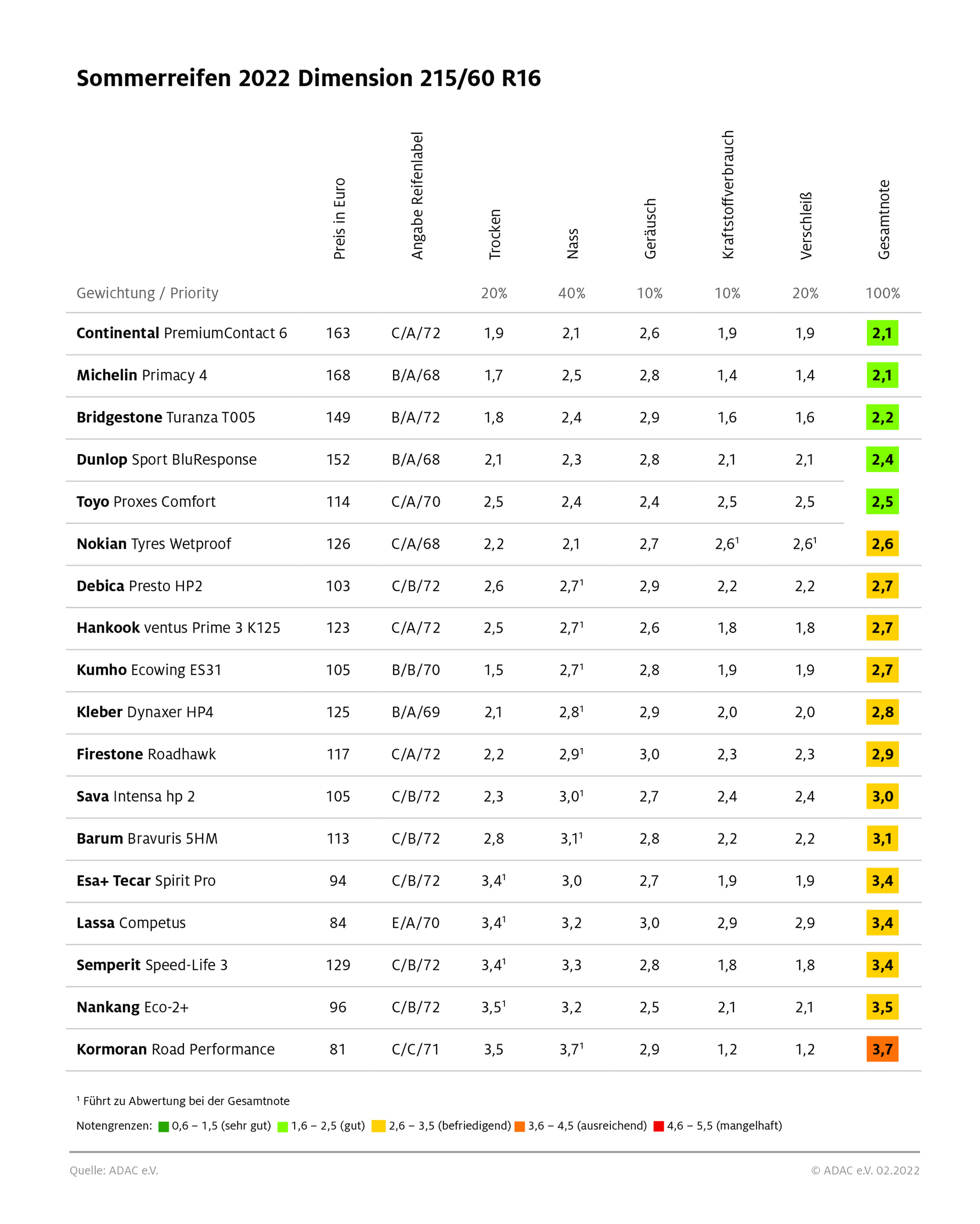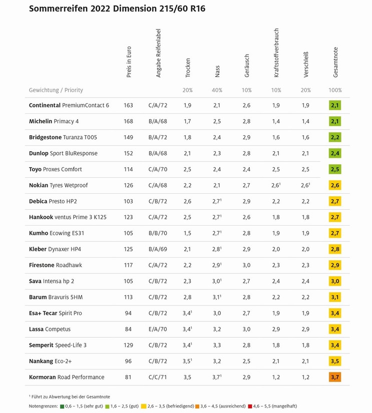 Na začetku je potrebno napisati, da so strokovnjaki kluba ADAC izredno zadovoljni z rezultati letošnjega velikega testa letnih pnevmatik, ker se je izkazalo, da proizvajalci pnevmatik poznajo rezultate takšnih testov in konstantno izboljšujejo njihove gumarske izdelke na osnovi priporočil največjega nemškega avtomobilskega kluba. Posledično je večina testiranih 15- in 16-palčnih pnevmatik tokrat dobila dobre in zadovoljive ocene, med slabo ocenjenimi 16-palčnimi 'črnimi gumijastimi ovcami' pa so izpostavili samo izdelek (model Road Performance, nemška prodajna cena ene pnevmatike: 81 evrov) poljske znamke Kormoran, ker gre v tem primeru za izrazito varčevalno orientirano pnevmatiko, ki sicer resnično blesti (najboljša ocena ob primerjavi s konkurenco) v pogledu možnega znižanja povprečne porabe pogonskega goriva, vendar ima to tudi ceno v obliki izrazito (najslabše ocenjena pnevmatika) slabšega oprijema ob vožnji po mokrem vozišču, prav nič pa ni impresivna tudi ocena takšne letne pnevmatike ob vožnji po suhem vozišču. Posledično si je ta pnevmatika kot edina izmed vseh tokrat testiranih pnevmatik prislužila samo oceno „ausreichend“ (zadostno).