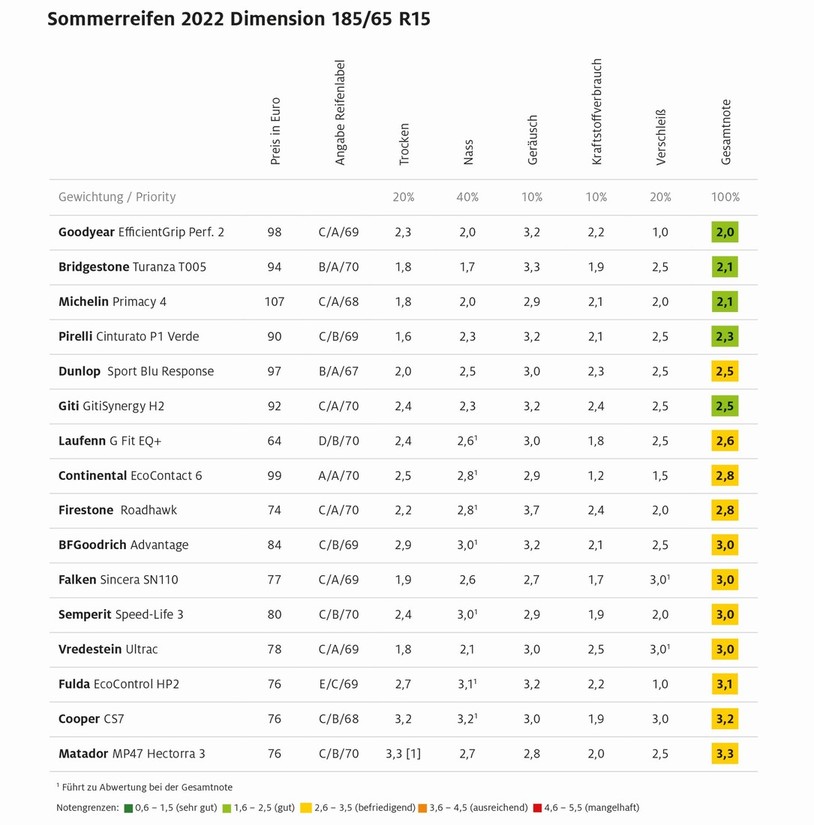 Nemci so tokrat testirali tudi 16 15-palčnih pnevmatik, ki so večinoma namenjene aktualnim predstavnikom evropskega B (supermini) segmenta. 6 takšnih pnevmatik si je tokrat prislužilo oceno „gut“ (dobro), kot pravo posebnost na tem testu pa velja omeniti izdelek znamke Goodyear (model EfficientGrip Perf. 2, 98 evrov), ki si je kot edina tokrat testirana pnevmatika prislužil najboljšo povprečno oceno 2, tudi na račun izredne dolgoživosti, ker ima ta pnevmatika najnižjo oceno obrabe izmed vseh tokrat testiranih 15- in 16-palčnih pnevmatik. V tem pogledu je pnevmatika znamke Michelin (model Primacy 4, 107 evrov) nekoliko slabša, je pa bolj ekonomična ob ravnanju z gorivom in boljša ob vožnji po suhem. Za voznike, ki jim je pri pnevmatiki najbolj pomemben oprijem na cestišču je prva izbira izdelek znamke Bridgestone (model Turanza T005, 94 evrov), ki pa posledično ne blesti na področju obrabe. Najboljši oprijem na suhi vozni podlagi pa ponuja pnevmatika znamke Pirelli (model Cinturato P1 Verde, 90 evrov). Še malenkostno slabše sta ocenjena izdelka znamk Dunlop (model Sport BluResponse, 97 evrov) in Giti (model GitiSinergy H2, 92 evrov), ki se kljub temu še vedno lahko pohvalita z oceno „gut“ (dobro). Čeprav že vrabci redno čivkajo, da varčevanje z denarjem ob nakupu novih pnevmatik ni ravno najpametnejša poteza, si bodo tisti, ki radi varčujejo na napačnih mestih lahko omislili tudi solidno ocenjeno 15-palčno pnevmatiko nizkocenovne znamke Laufenn (model G Fit EQ+), za katero bodo v nemških trgovinah odšteli samo 64 evrov.