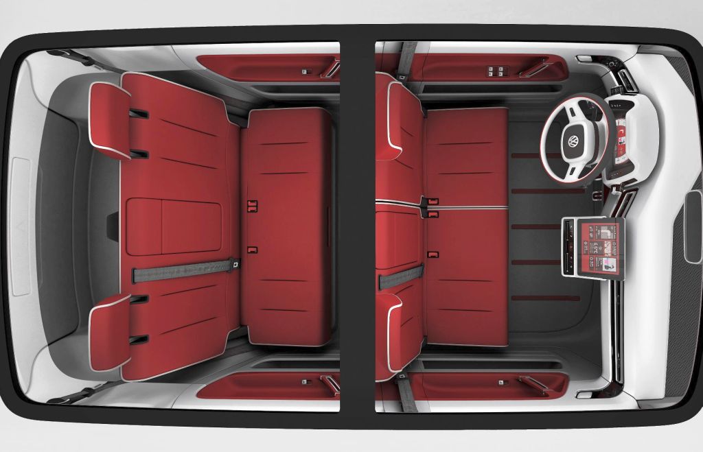 Volkswagnova električna 'multipla' se premika ob pomoči litij-ionske baterije s kapaciteto 40 kilovatnih ur, ki oskrbuje z energijo 115 'konjski' električni motor, ki lahko sprosti 260 Nm motornega navora. Tako motoriziran prototip ima približno 300 kilometrov akcijskega radija ter tovarniško omejeno končno hitrost 140 km/h. Ponuja pa tudi solidne pospeške (od 0-100 km/h: 11,5 sekunde). V notranjosti potniške kabine boste zaman iskali centralno konzolo ali menjalno ročico, namesto tega pa najdemo iPad, ki je odstranljiv in prevzema vse 'infotainment' funkcije, vozniku pa poleg volana in kontrolnih stopalk ostaneta samo dva, levo in desno nameščena vrtljiva gumba, ki se nahajata na bočnih stranicah ohišja glavnega kontrolnega merilnika pred voznikom. Levi gumb je namenjen uporabi svetil, desni pa določa smer gibanja (naprej / nazaj) vozila.