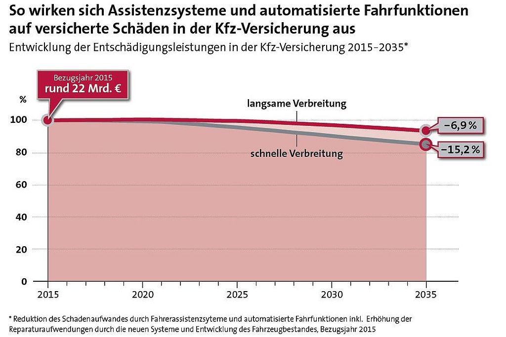 Zato so že znižali tudi pričakovanja glede možnih prihrankov pri izplačilih premij njihovim oškodovancem, čeprav bo v bližnji prihodnosti na cestah še več vozil z vgrajenimi asistenčnimi sistemi in funkcijami, ki bodo uporabnikom omogočale delno avtonomno vožnjo. Nemški zavarovalničarji računajo, da naj bi leta 2025 prihranili samo od 7- do 15-odstotkov denarja, ki so ga oškodovancem izplačali leta 2015. Takrat so za poplačila porabili približno 22 milijard evrov. Po mnenju Nemcev so sodobni asistenčni sistemi zaslužni za dvig varnosti (mnenje ob neupoštevanju hekerskih napadov in napak v delovanju programske opreme …), vendar je njihova razširjenost trenutno omejena.