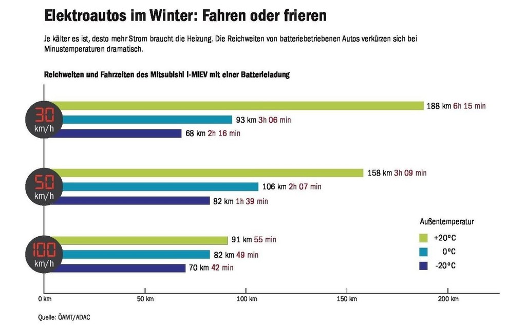 Izguba pogonske energije v zimskem času bo še večja zaradi vgrajenih akumulatorjev, ki imajo zaradi zahtev po njihovem dobrem termičnem počutju poleg hladilnikov vgrajene tudi grelce. Zaradi tega Nemci svetujejo uporabnikom električnih avtomobilov, da naj se pozimi pred vožnjo električnega avtomobila raje bolj toplo oblečejo, najbolj hvaležni za to, da delovanje kabinskega gretja potem ni nastavljeno 'na polno', jim bodo vgrajeni akumulatorji. Kako pogubno lahko nizke temperature ozračja zavrejo 'zimske radosti' lastnikov električnih avtomobilov pa prikazuje primerjalna tabela kluba ADAC. Ko se boste z vašim 'elektro-bushijem' vozili pri 20 stopinjah Celzija po Portorožu in vam je jasno, da počasna vožnja (30 km/h) poleg varnosti prinaša tudi 'biti viden' efekt, boste ob slovenski obali z enim samim polnjenjem akumulatorjev prevozili 188 kilometrov. Celotna pustolovščina bo v tem primeru trajala 6 ur in 15 minut. Ko boste s takšnim avtomobilom obiskali Kranjsko goro pri -20 stopinjah Celzija, boste z isto hitrostjo (30 km/h) in ob enakih pogojih prevozili samo še 68 kilometrov, občutno krajša pa bo tudi vožnja (2 uri in 16 minut). Se vam v življenju dostikrat mudi? Tudi v tem primeru vam električni avtomobil ni pisan na kožo. Mitsubishi, ki je poleti s hitrostjo 30 km/h z enim samim polnjenjem akumulatorjev prevozil 188 kilometrov, bo po obisku kakšne avtoceste, kjer bo lahko vozil s hitrostjo 100 km/h, prevozil samo 91 kilometrov. Zaradi tega Nemci svetujejo lastnikom tudi to, da naj ob načrtovanju zimskih voženj upoštevajo dejstvo o 'splošni ranljivosti' električnih avtomobilov ob takšnih pogojih delovanja in temu primerno prilagodijo vozne načrte in stil vožnje.
