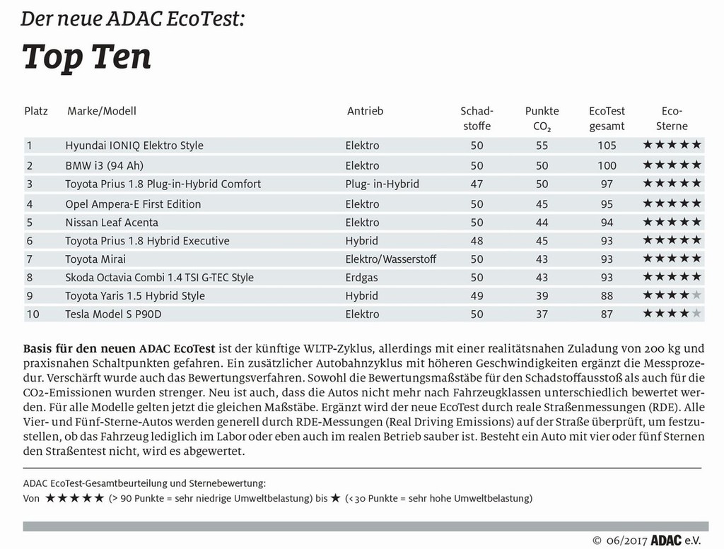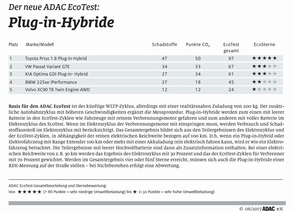 Zato so vsakega testnega kandidata pred pričetkom meritev otovorili z dodatnimi 200 kilogrami mase, ki ponazarja morebitne potnike in tovor. Vsak testni kandidat je lahko ob ocenjevanju prejel največ 100 možnih točk, od tega jih je pol lahko povezanih z oceno CO2 izpustov, preostalih 50 točk so delili na podlagi količine preostalih (dušikovi oksidi (NOx) in trdni delci) ustvarjenih škodljivih izpustov za okolje. Med tokrat testirano peterico serijskih modelov priključnih hibridov je ponovno blestel samo serijski model znamke Toyota, ker si je prius 1.8 'Plug-in Hybrid' kot edini testirani avtomobil prislužil najboljšo možno oceno (5 ekoloških zvezdic).