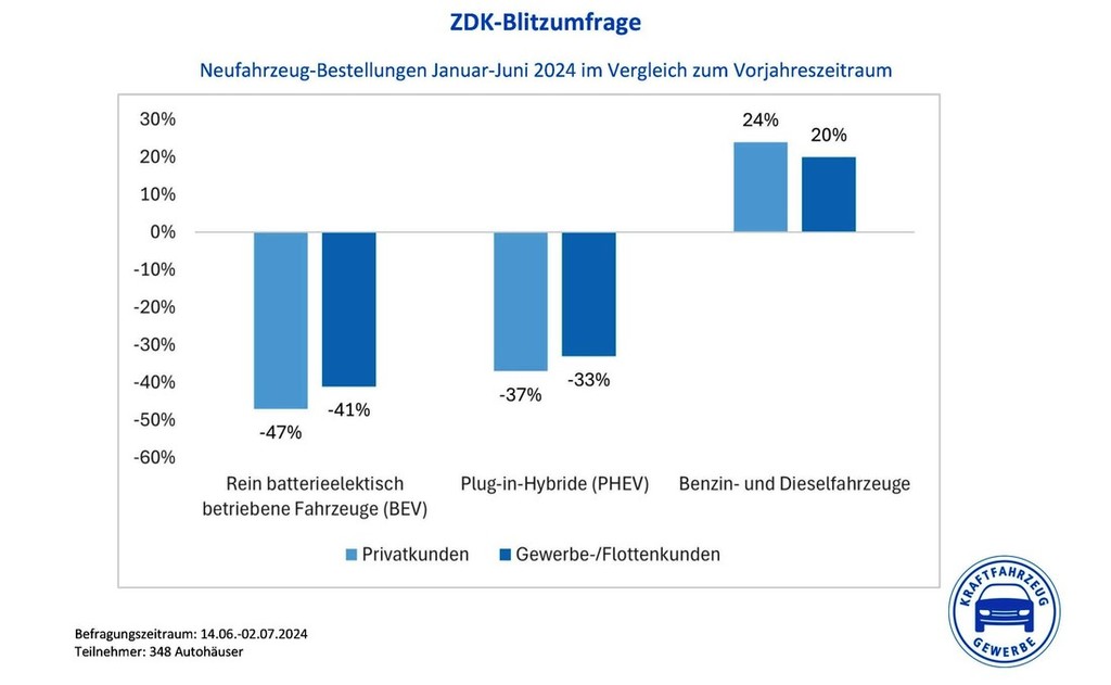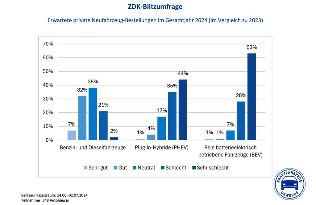 Kar 91 odstotkov izmed vseh vprašanih nemških trgovcev, ki so sodelovali v nedavno izvedeni anketi organizacije ZDK je trenutno zanimanje nemških kupcev za nove električne avtomobile označilo kot "sehr schlecht" (zelo slabo), podobno je na vprašanje o zanimanju nemških kupcev za nove priključne hibride odgovorilo 79 odstotkov izmed vseh vprašanih nemških trgovcev z avtomobili. Podobno slabo je tudi zanimanje nemških podjetij za podobno gnana službena vozila. Precej bolj optimistično (39 % izmed vseh vprašanih …) so nemški trgovci razpoloženi glede pričakovanj ob prodaji novih fosilno gnanih vozil, medtem ko je 38 odstotkov izmed vseh vprašanih prepričanih, da bodo letos nemškim kupcem dostavili podobno količino fosilno gnanih novih avtomobilov kot lani.