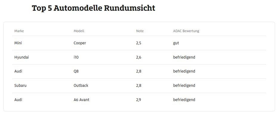 Nemci ob tem ugotavljajo, da se s slabo preglednostjo iz vozil spopadajo predvsem vozniki velikih in težkih vozil, medtem ko je pri majhnih, odnosno kompaktnih (vozilo s karoserijo, ki ni daljša od 410 cm …) vozilih preglednost iz vozil boljša, čeprav nemške ocene vidljivosti iz vozil kažejo na to, da se vidljivost iz vozil konstantno slabša (povprečna ocena vidljivosti leta 2019: 3,2, povprečna ocena leta 2025: 4,2). Izmed več kot 430 ocenjenih vozil (2019-2025) so Nemci omenili dva predstavnika majhnih, odnosno kompaktnih avtomobilov, ki voznike še lahko razveselita z dobro preglednostjo iz vozila. Ob tem omenjajo aktualnega 3-vratnega minija (ocena 2,5) in malega Južnokorejca (hyundai i10, ocena 2,6). Minija, ki je zmagovalec te primerjave, hvalijo predvsem zaradi bolj pokončno nameščenega para A stebričkov, zamerijo mu samo nekoliko slabši pogled na semaforje v primeru, ko vozilo miruje direktno pred semaforjem, ker se mora voznik v tem primeru zavihteti naprej, da dobi dober pogled na semafor. Čeprav ob tem govorimo o zmagovalcu te primerjave, mu Nemci vseeno zamerijo tudi to, da sta oba strešna A stebrička zajetnih mer, poleg tega je konec prednjega dela vozila slabo viden. Podobno dobro je ocenjen tudi hyundai i10, ki mu zamerijo samo to, da voznik iz njega težko opazi kakšne nižje ležeče ovire. Zato priporočajo vgradnjo parkirnih senzorjev in kamere za vzvratno vožnjo.