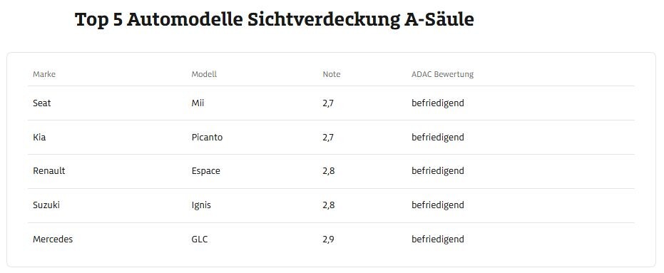Mogoče se komu zdi, da Američani (Consumer Reports) in tudi Nemci (ADAC je tudi v preteklosti že objavil podobne študije …) pretiravajo glede izbora vozil z najboljšim in najslabšim pregledom (odnosno vidljivostjo) iz vozila med vožnjo skozi križišča ter še posebej pri vožnji skozi ovinke, ki potekajo v levo. Resnica je drugačna. Po nemških navedbah se v Nemčiji zaradi slabe preglednosti iz vozila in posledične 'slepote' voznikov zgodi veliko (vsaka četrta …) težkih prometnih nesreč. Statistično gledano je vsak sedmi mrtvec na nemških cestah žrtev poslabšane vidljivosti iz vozila. Paradoksalno pri celi zadevi je to, da bolj masivno izražen in bolj položno postavljen par sprednjih A-stebričkov (omenjajo pa tudi previsoke bočne linije karoserije in prenizka bočna vetrobranska stekla, masivno izražene prednje dele vozil in dolge pokrove motorjev …) pri nekaterih modernih avtomobilih predstavlja posledico povečanih zahtev po varnosti v primeru čelnega trka ter ekonomičnosti (aerodinamika), ki pa žal prinaša posledično nevarnost v obliki nepreglednosti, odnosno slabe vidljivosti iz vozila. Ob tem se je potrebno zavedati dejstva, ki pravi, da boste z vertikalno dvignjenim svinčnikom (približna širina: 8 mm) v stegnjeni roki, nameščenim pred vidnim poljem opazovalca prekrili vsakega pešca, motociklista ali kolesarja na razdalji 60 metrov …