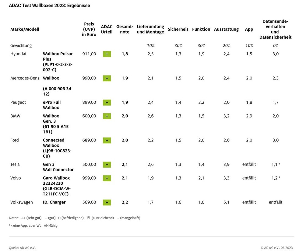 Vendar ob tem obstaja tudi omejitev, in to glede izbora vaše avtomobilske znamke, ker si tako poceni polnilno postajo lahko omislijo samo lastniki električnih avtomobilov znamke Tesla Motors, podobno draga (+ 69 evrov) je tudi domača električna polnilna postaja znamke Volkswagen, ki se je tokrat uvrstila na zadnje mesto med vsemi testiranimi polnilnicami, čeprav to še ne pomeni, da je slaba, ker se vseh osem tokrat testiranih polnilnih postaj lahko pohvali z oceno 'gut' (dobro). Nemci so bili na tem testu najbolj navdušeni nad izdelkom znamke Hyundai ('Hyundai Wallbox Pulsar Plus'), ki sicer ni najcenejši (nemška prodajna cena: 911 evrov), vendar kupec za odšteti denar dobi polnilno postajo z najbolje delujočo aplikacijo za pametne telefone. Na drugem mestu je pristal izdelek ('Mercedes-Benz Wallbox' (A 000 906 34 12)) znamke Mercedes-Benz, kjer bodo od vas ob nakupu njihove polnilne postaje zahtevali več denarja (nemška prodajna cena: 990 evrov). Najdražja pa je polnilna postaja znamke Volvo (Volvo Garo Wallbox 32324230 (GLB-DCM-W-T211FC-VCC)), čeprav gre v tem primeru za izdelek, ki se je tokrat uvrstil na predzadnje mesto razpredelnice, čeprav ob tem ni ni najboljši po nobenem izmed testnih kriterijev. To je nov dokaz, da nekaj kar je drago, ni vedno tudi dobro.