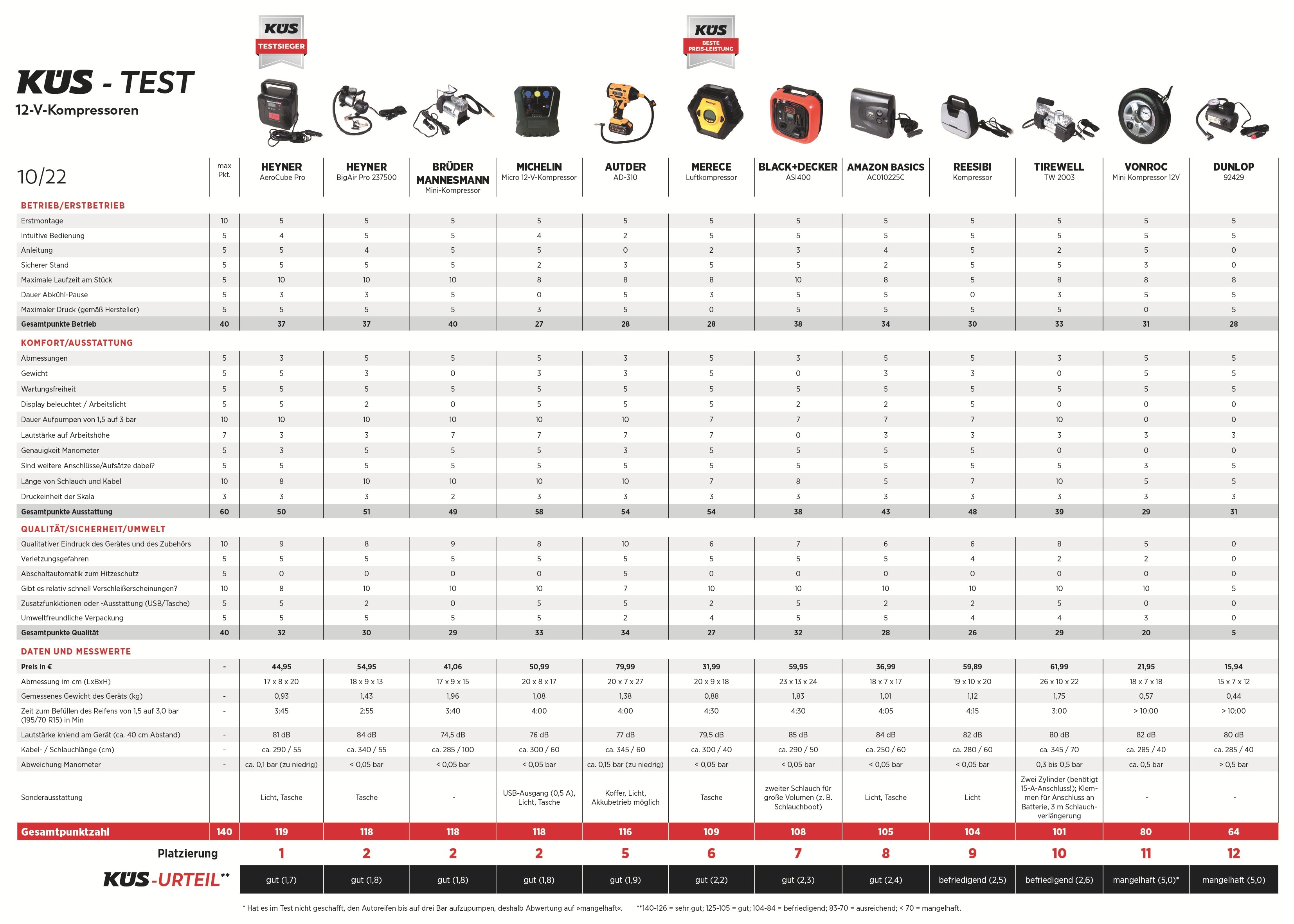 Vendar je bila zmaga modela AeroCube Pro zelo tesna, ker je zmagal s samo eno točko prednosti, in to pred modelom znamke Heyner (BigAir Pro 237500, približno 55 evrov), z oceno 'gut' pa je bilo tokrat nagrajenih še šest drugih 12-voltnih kompresorjev. Oba omenjena zmagovalna kompresorja blestita predvsem v pogledu glasnosti delovanja, ker sta občutno tišja od konkurence, zmagovalec testa in izdelek znamke Autder (model AD-310, skoraj 80 evrov …) pa blestita tudi v pogledu točnosti pritaknjenih manometrov, najhitrejši pa je izdelek znamke Heyner, ki je zadano nalogo (dvig pritiska iz 1,5 na 3 bare v pnevmatiki v dimenzijah 195/70 R15) opravil v dveh minutah in 55. sekundah. V tem pogledu sta najslabša nizkocenovna izdelka znamk Vonroc (model Mini Kompressor 12V, skoraj 22 evrov …) in Dunlop (model 92429, skoraj 16 evrov …), ker bo vsak izmed njiju za dokončanje naloge potreboval približno 10 minut časa. Ob tem bosta tudi 'opravilno nesposobna', ker s takšnim 'poflom' sploh ne boste v stanju napolniti pnevmatike do predvidenih treh barov pritiska, vaših pričakovanj bo namreč konec že pri približno 2,5 bara pritiska. Pri izdelku znamke Dunlop lahko uporabnik dobi tudi kakšno opeklino, ker se cevka za dovod zraka v pnevmatiko zelo segreva … Zato sta bila oba kompresorja na koncu deležna sramotne ocene 'mangelhaft' (slabo), razumni kupci se bodo paru takšnih kompresorjev raje izognili.