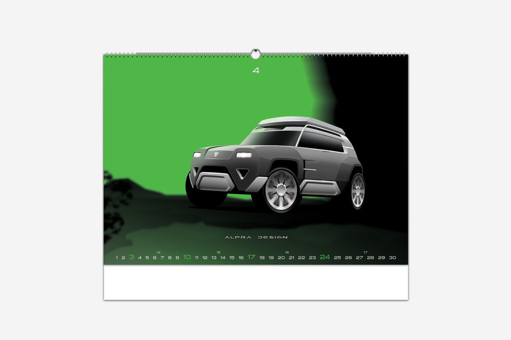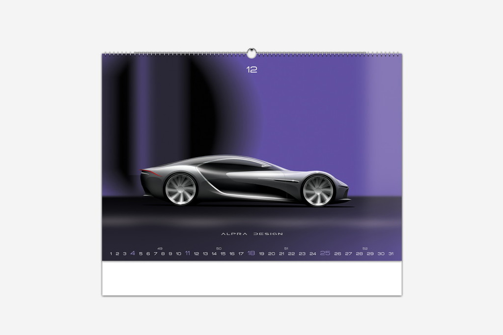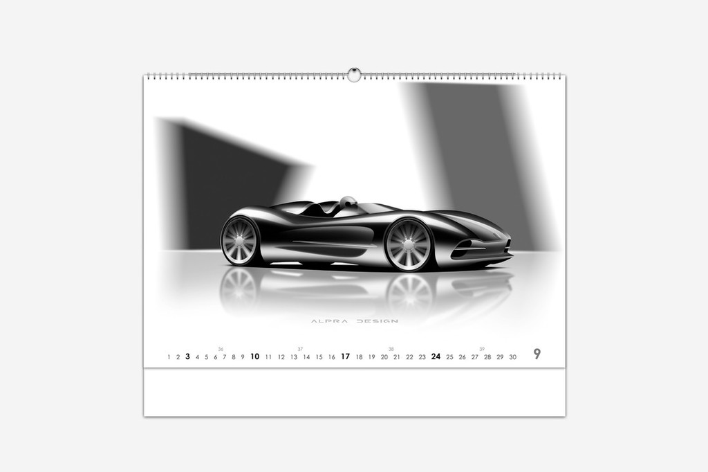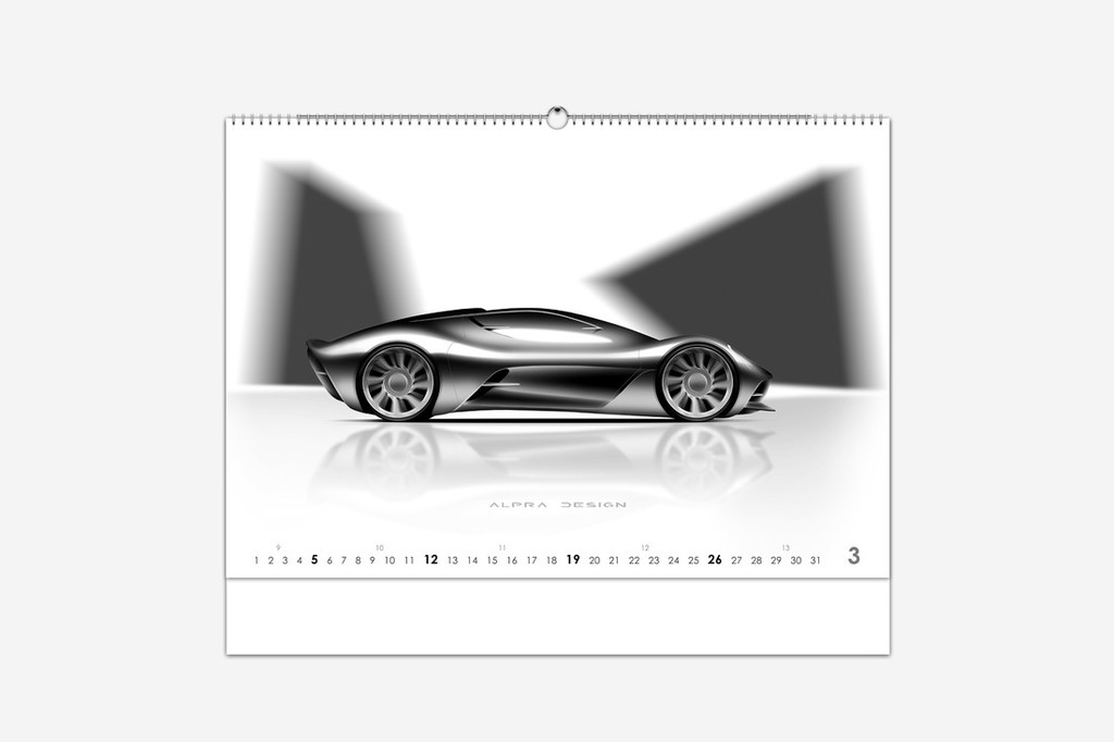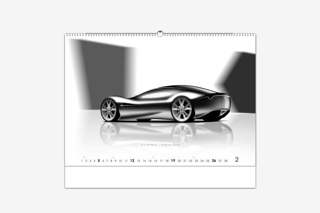 predstavljeni avtomobilski dizajni zasnovani namensko za koledar. V razvoj posameznega koledarja je vloženih več mescev dela! Z nadpovprečno kakovostjo in detajli odstopajo od množičnosti. Povrh je vsak izvod ročno podpisan in oštevilčen ter vstavljen v kartonsko škatlo, v kuverti pa je dodana še poštna kartica z motivom s koledarja. Koledarji ALPRA DESIGN so idealno darilo za tiste, ki želijo delovati nevtralno in podariti nekaj pristno slovenskega, kakovostnega, z dolgo tradicijo in