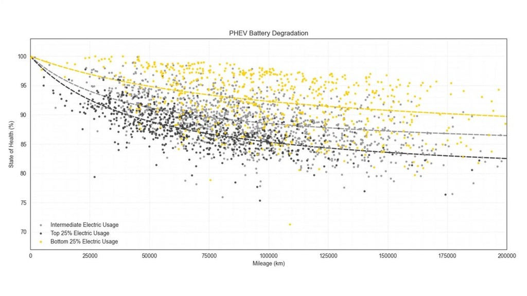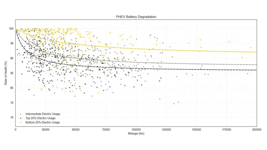 Povsem logično je, da je stopnja degradacije akumulatorjev odvisna od tega kako pogosto se uporabniki priključnih hibridov premikajo samo ob pomoči elektrike, zato strokovnjaki odsvetujejo nakup priključnega hibrida vsem tistim, ki želijo ob pomoči elektrike prevoziti večje število kilometrov. Za takšne uporabnike je bolje, da si omislijo nakup striktno električno gnanega avtomobila. Kot najboljše pa omenjajo akumulatorje, ki so v priključnih hibridih znamke Mercedes-Benz, ker je njihova degradacija zelo majhna vse do približno 200.000 prevoženih kilometrov. Tega pa ne moremo reči za akumulatorje v vozilih znamke BMW, kjer je njihova dolgoživost odvisna predvsem od pogostosti uporabe električnega pogona. V tem pogledu so na boljšem lastniki priključnih hibridov znamke Volvo in priključnih hibridov iz skupine Volkswagen, ker je njihova degradacija manjša tudi pri velikem številu prevoženih kilometrov. Manj so bili Nemci in Avstrijci navdušeni nad akumulatorji v priključnih hibridih znamke Ford, kjer je prišlo do občutne degradacije že po samo 75.000 prevoženih kilometrih. Zanimivo pa je obnašanje akumulatorjev pri vozilih znamke Mitsubishi, kjer je degradacija zelo izrazita na začetku njihove življenjske poti, kasneje pa se 'stabilizirajo'.