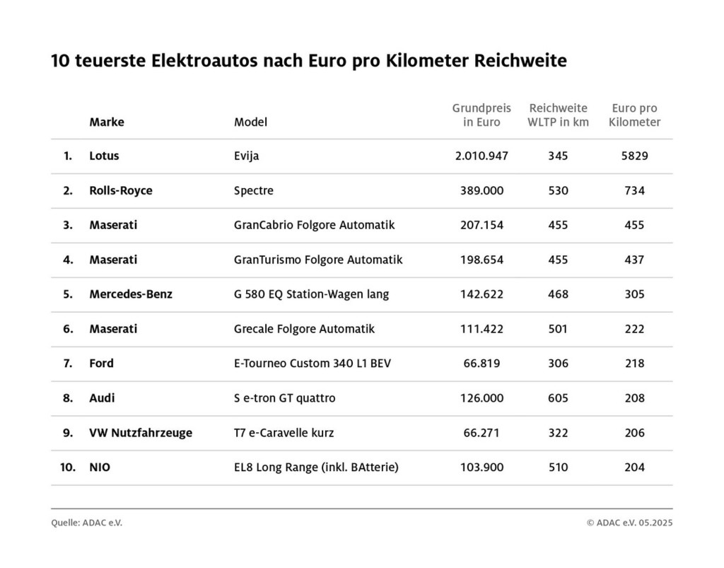 Na povsem nasprotni strani pa lahko najdete striktno električno gnane avtomobile kot je Lotusov model evija. Za ta resnično že prav nesramno drag avtomobil mora kupec v Nemčiji ob nakupu odšteti dobra dva milijona evrov, in to za avtomobil, ki se lahko 'pohvali' s 345 WLTP kilometri akcijskega dosega! Posledično bo lastnik tega vozila za vsak prevožen kilometer plačal že prav neverjetnih 5.829 evrov. Na splošno pa velja, da so velika in posledično tudi zelo težka električna vozila zelo nagnjena k temu, da na vsakem prevoženem kilometru dobro opustošijo denarnice njihovih lastnikov, ker to ne velja samo za prestižne 4-kolesnike, temveč tudi za potniške kombije kot so na primer izdelki znamk Ford, Mercedes-Benz in Volkswagen.