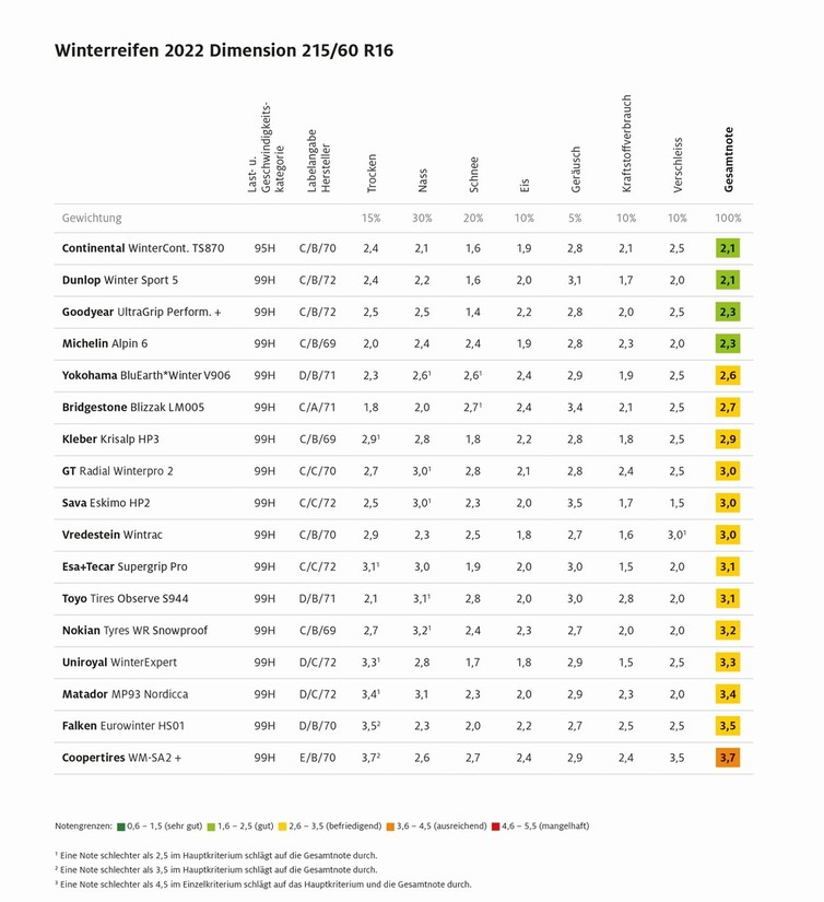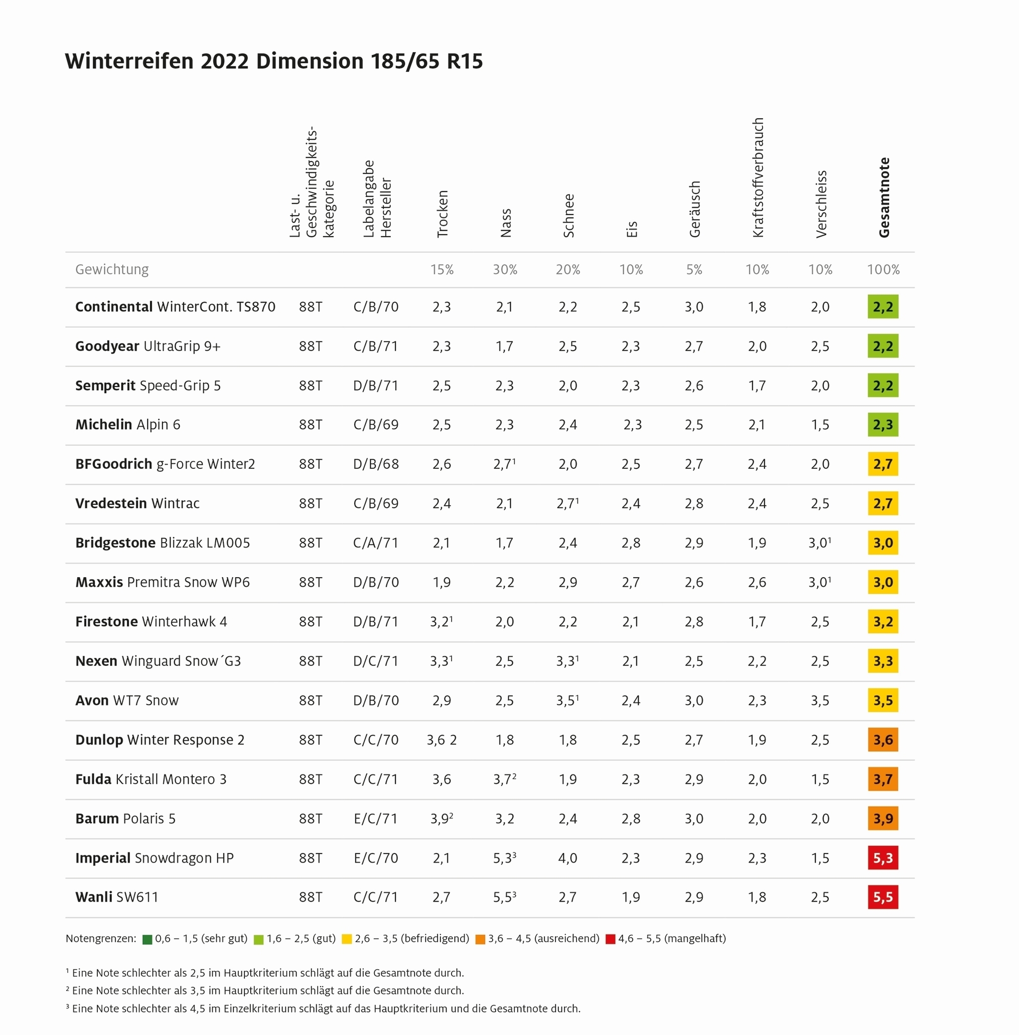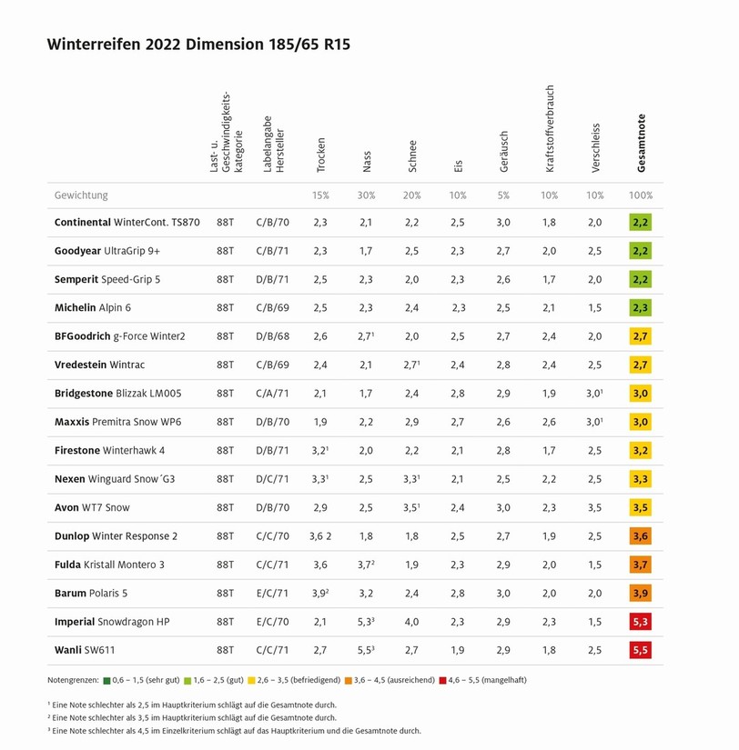 Med aktualnimi zimskimi pnevmatikami v dimenzijah 185/65 R15 so bili Nemci tokrat najbolj navdušeni (ocena 'gut' (dobro)) nad izdelki znamk Continental, Goodyear, Semperit in Michelin, ker so se omenjeni gumarski izdelki izkazali v vseh pogojih (vožnja po mokrem, vožnja po suhem in vožnja po snegu in ledu). Na suhi vozni podlagi je bila najboljša pnevmatika znamke Michelin (Alpin 6), medtem ko je za vožnjo po mokrem najboljša zimska pnevmatika znamke Goodyear (UltraGrip 9+). Dobili pa smo tudi zimsko pnevmatiko, ki se najbolje obnese ob vožnji po snegu. Ta pnevmatika nastaja v obratih znamke Semperit (Speed-Grip 5). Najbolj uravnotežena glede voznih razmer pa je zimska pnevmatika znamke Continental (WinterCont. TS870). Na koncu so vse 4 pnevmatike prejele dokaj podobno skupno oceno, zato bo o nakupu katere izmed teh štirih omenjenih zimskih pnevmatik najbrž odločala njihova prodajna cena.