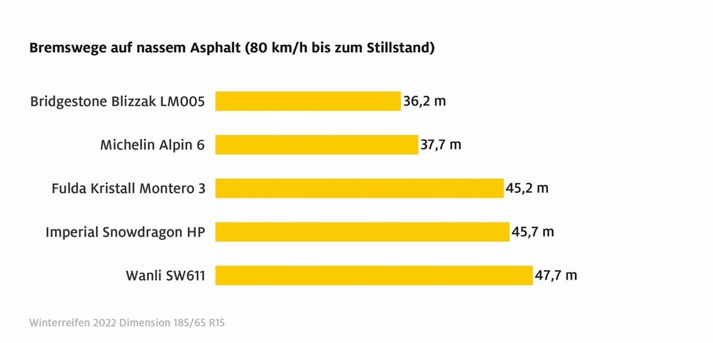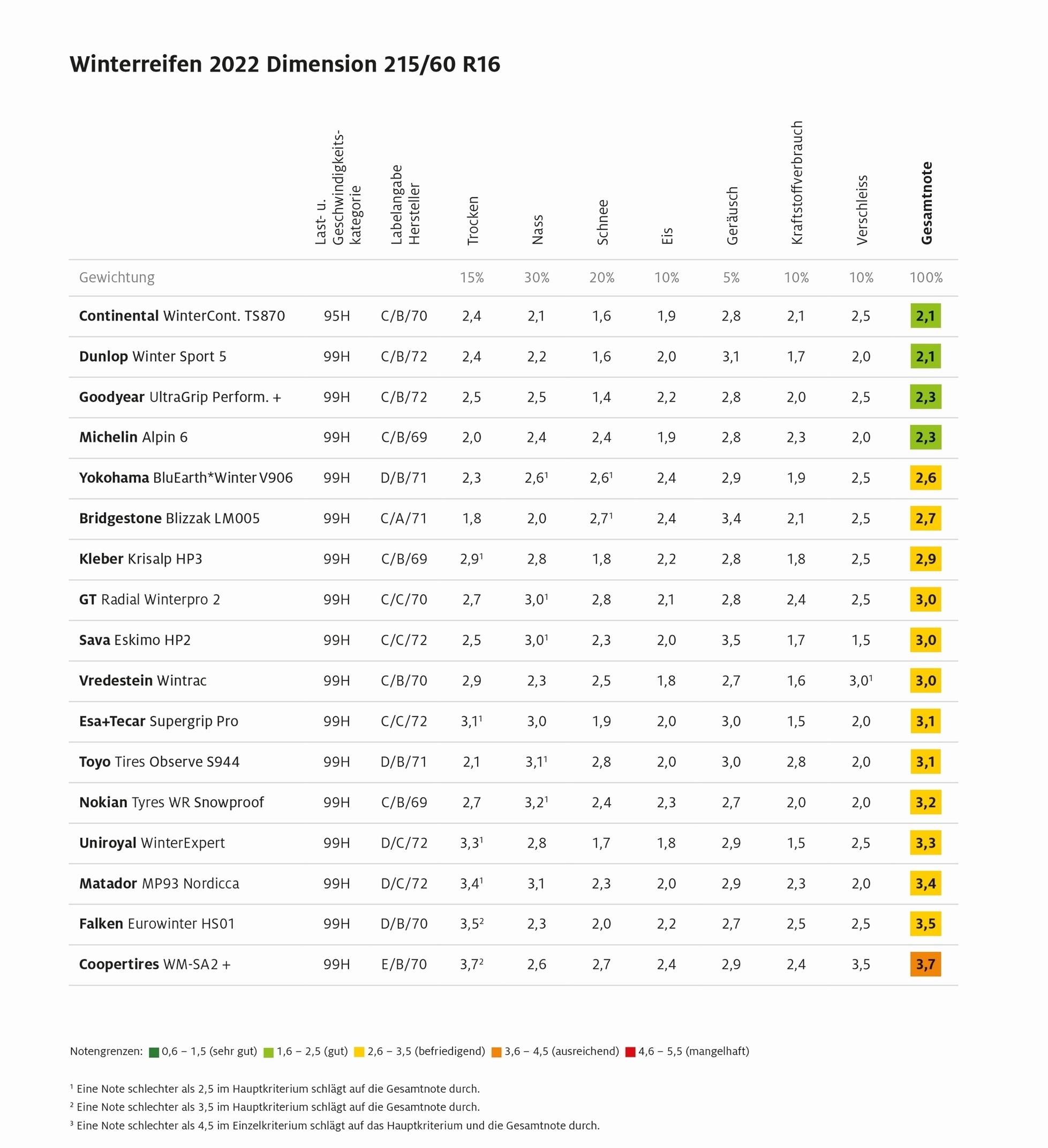 Medtem ko se boste z zimsko pnevmatiko znamke Bridgestone (Blizzak LM005) dokončno ustavili že po dobrih 36. metrih zavorne poti, bo pnevmatika znamke Wanli za uspešno ustavljanje avtomobila potrebovala veliko več prostora (skoraj 48 metrov …), odnosno dolžino treh resnično kompaktnih avtomobilov … Zato sta ti dve 'zimski' pnevmatiki zelo primerni samo za 'nezimske' razmere (vožnja po suhem …) in na koncu ocenjeni s sramotno oznako 'mangelhaft' (pomanjkljivo), ki bo od nakupa odvrnila vsakega razumnega kupca (ljudje, ki radi varčujejo na nepravih mestih, jih bodo seveda pridno kupovali, predvsem zaradi nizke prodajne cene …). Nekoliko drugačna je zgodba v primeru večje odmerjenih (215/60 R16) tokrat testiranih zimskih pnevmatik, ker smo v tem primeru dobili zmagovalce znamk Continental, Dunlop, Goodyear in Michelin. Tudi tokrat so bili Nemci zelo naklonjeni izdelku znamke Continental (WinterCont. TS870), preseneča pa tudi odlična uvrstitev zimske pnevmatike znamke Dunlop (Winter Sport 2), ki je za razliko od njene manjše sorodnice (Winter Response 2) ocenjena zelo dobro.