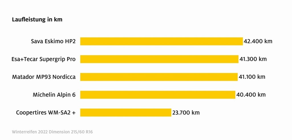 Na tokratnem testu je nastopilo tudi 'nekaj' iz Slovenije, vendar ne v obliki strokovnjakov AMZS, ki se potem pri nas doma radi kitijo s tujim perjem (oni so 'sodelovali' na takšnem testu …), temveč zimska pnevmatika znamke Sava (Eskimo HP2), ki se je tudi tokrat uvrstila v zlato sredino (ocena 'befriedigend' / zadovoljujoče), ker so Nemci ponovno razkrili njeno slabo lastnost (Savina zimska pnevmatika ne mara dežja …), se pa kranjski 'Eskim' dobro znajde na suhi in zasneženi cesti ter na ledu. Poleg tega se Savina pnevmatika lahko pohvali z najboljšim izplenom prevoženih kilometrov med 16-palčnimi pnevmatikami, ker boste z njo v povprečju lahko prevozili dobrih 42.000 kilometrov. Če bi si radi čimprej spet kupili nov set zimskih pnevmatik, potem si morate omisliti izdelek znamke Coopertites (WM-SA2), ker jih boste morali nadomestiti že po dobrih 24.000 prevoženih kilometrih. Tudi v drugih pogledih ta pnevmatika ni ravno najboljša, sploh pa ji ne leži vožnja po suhi vozni podlagi. Zato je to edina tokrat testirana 16-palčna zimska pnevmatika, ki je dobila samo oceno 'ausreichend' / zadostno, odnosno 'bedingt empfehlenswert' (pogojno priporočljivo).