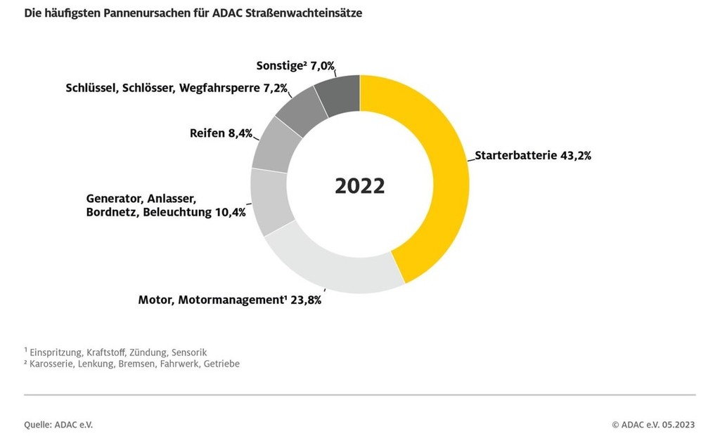 Po pregledanih statistikah okvar so Nemci ugotovili, da je okvara klasičnega akumulatorja največja 'rak rana' številnih sodobnih avtomobilov, ker je bilo kar 43,2 odstotka prejetih klicev na pomoč povezanih ravno z odpovedmi akumulatorjev. Odpovedujejo pa tudi pogonski motorji in njihova elektronika. Zato so takšne okvare na drugem mestu (23,8 %) lestvice najpogostejših vzrokov za delovni obisk mobilnih 'rumenih angelov'. Na tretjem mestu (10,4 %) pa najdemo lastnike avtomobilov, ki jim je med vožnjo odpovedal alternator, štarter, zunanji svetlobni elementi ali pa elektronika na območju armaturne plošče. Zaradi 'gumidefektov' so morali posredovati v 8,4 odstotka primerov, 7,2 odstotka izmed vseh, ki so na cesti potrebovali pomoč, pa je imelo težave s ključi, ključavnicami ali pa blokadami motorjev. Kako pa je z medijsko opevano nepokvarljivostjo električnih avtomobilov ob primerjavi s fosilno gnanimi avtomobili?