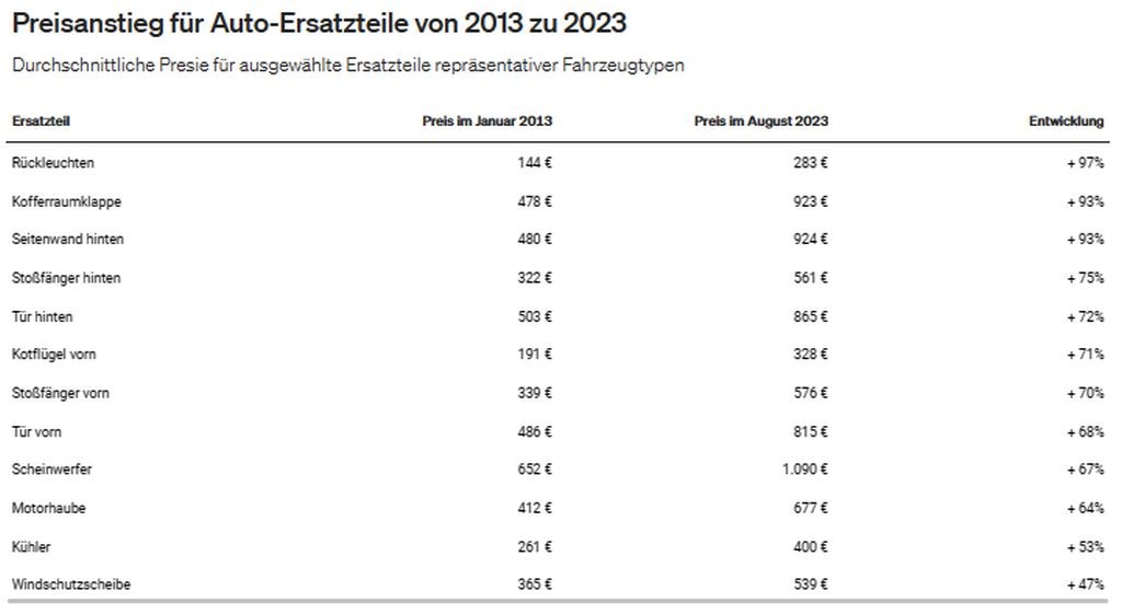 Nemci so ob tem zajeli 34 različnih modelov avtomobilov različnih proizvajalcev, ki so istočasno tudi predstavniki različnih cenovnih razredov avtomobilov. Posledično lahko ob tem govorimo samo o povprečno izračunanih prodajnih cenah posameznih rezervnih sestavnih komponent sodobnih avtomobilov, ključna nemška ugotovitev pa je, da bodo obstoječe nemške zavarovalnice v bližnji prihodnosti primorane k občutnemu dvigu zavarovalnih premij, ker postajajo popravila sodobnih avtomobilov čedalje dražja.