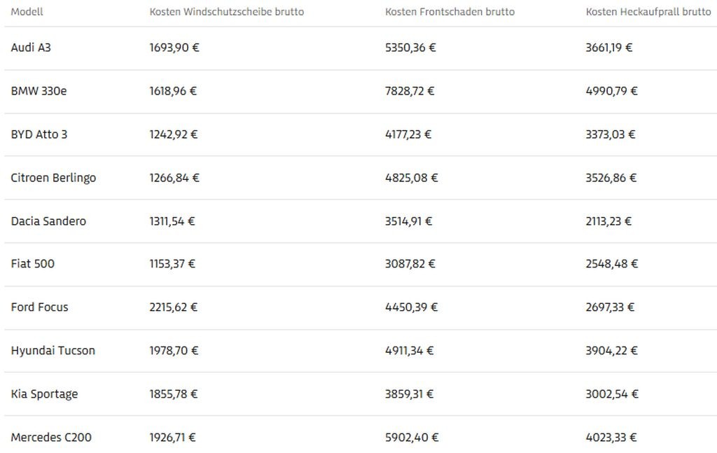 Nemci so tokrat primerjali stroške popravil pri 21. modelih različnih proizvajalcev in ob tem ugotovili občutne razlike glede višine stroškov popravil. Menjava vetrobranskega stekla pri vozilih brez vgrajene 'invalidske opreme' v obliki kamer in senzorjev vas bo v povprečju olajšala za približno 300 do 400 evrov, pri aktualnem golfu vas bo menjava vetrobranskega stekla v Nemčiji olajšala za približno 2.400 evrov, ker boste morali poravnati tudi stroške kalibracije vgrajene kamere. Zanimiv pa je tudi primer toyote corolle in suzukija swace. Čeprav gre v tem primeru za popolnoma enaka avtomobila, vas bo menjava vetrobranskega stekla pri suzukiju ožela še za dodatnih 200 evrov.