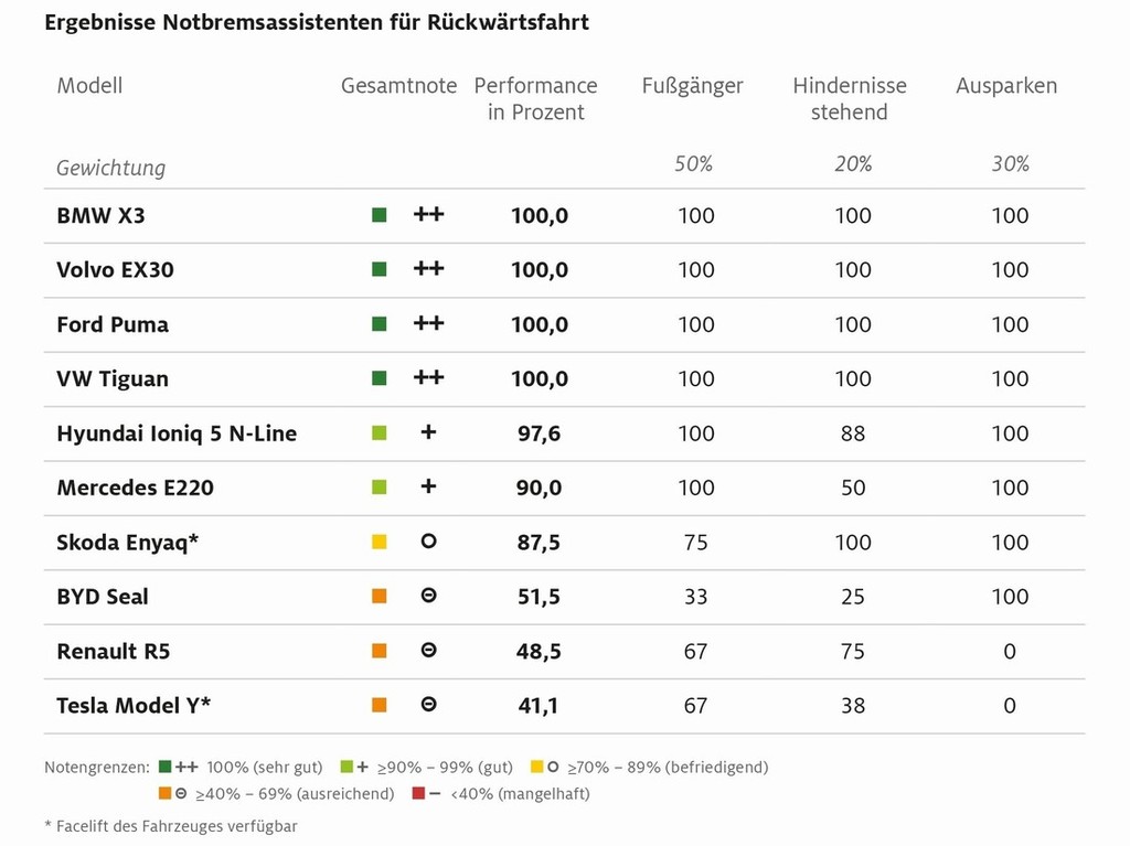 Vse to se odraža tudi v statistiki prometnih nesreč, povezanih z vzvratno vožnjo. Po podatkih kluba ADAC se vsako četrto trčenje s pešci zgodi ravno ob vzvratnem manevriranju z vozilom. Posledično morajo proizvajalci ob opremljanju takšnih 'podmornic' (v pogledu preglednosti iz vozila …) poskrbeti za vgradnjo različne 'invalidske opreme' v obliki sistemov za nadzor okolice za vozilom, ki pa v večini tokrat testiranih vozil niso delovali optimalno, odnosno 100-odstotno. To so razkrili različni testni scenariji, samo štirje izmed desetih testiranih sistemov za nadzor okolice za vozilom, ki so vgrajeni v vozila znamk BMW (X3), Volvo (EX30), Ford (puma) in VW (tiguan) so dobro (100-odstotno) opravili svoje delo.