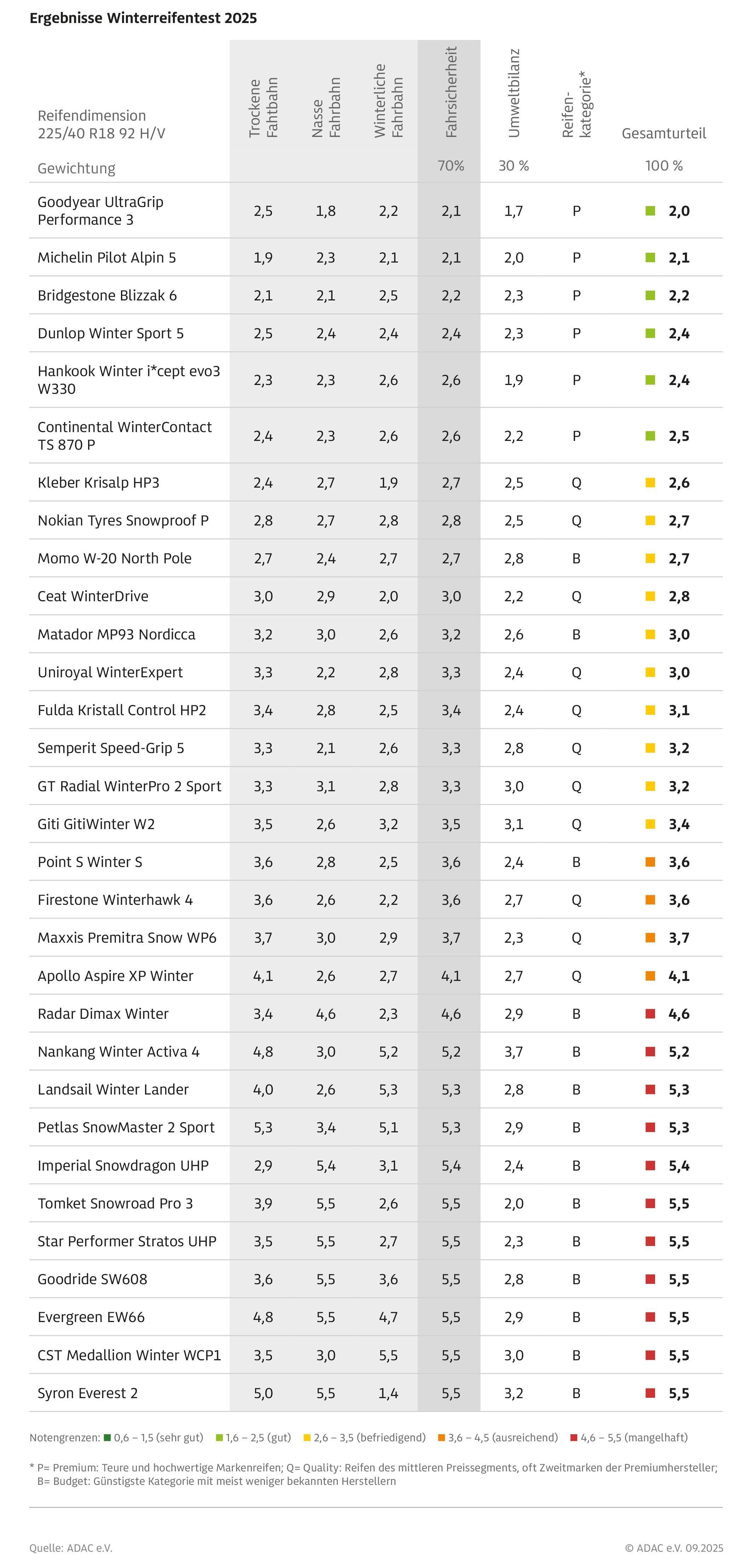 Na koncu je slavil izdelek znamke Goodyear (model UltraGrip Performance 3, povprečna nemška prodajna cena: 171 evrov po kosu), ki je prepričal strokovnjake kluba ADAC zaradi odličnega obnašanja te pnevmatike na mokrih voznih površinah, v tem pogledu se zmagovalni pnevmatiki ni mogla približati nobena izmed tokrat testiranih zimskih pnevmatik. Pnevmatika znamke Goodyear pa ne blesti samo v tej disciplini, ker je tudi najbolj dolgoživa (po izvedeni nemški simulaciji boste s takšnimi pnevmatikami lahko prevozili približno 76.000 kilometrov …). Na drugo mesto se je tokrat uvrstila pnevmatika znamke Michelin (tip Pilot Alpin 5, 177 evrov), ki pozimi blesti predvsem ob vožnji po suhih voznih površinah. Na tretjem mestu pa najdemo izdelek znamke Bridgestone (tip Blizzak 6, 167 evrov), podobno dobro ocenjena je tudi zimska pnevmatika znamke Dunlop (tip Winter Sport 5, 169 evrov).