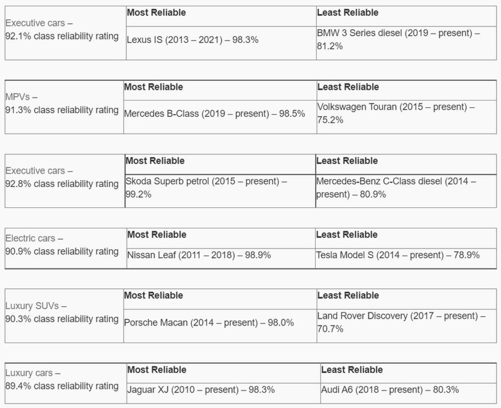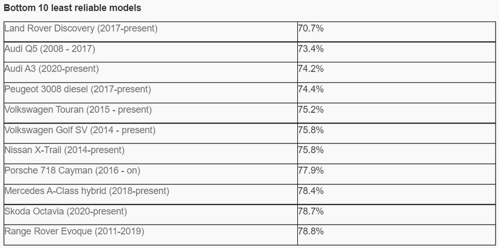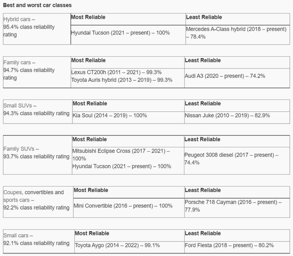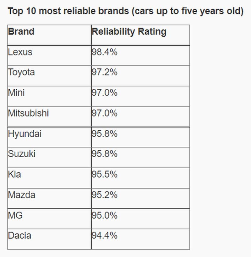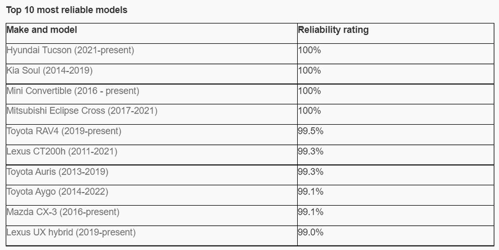 Britanci so tokrat izpostavili štiri avtomobile (hyundai tucson, mini convertible, kia soul (2014-2019) in mitsubishi eclipse cross (2017-2021)), ker gre za edina vozila, ki se lahko po petih letih starosti pohvalijo s 100 odstotno zanesljivostjo delovanja, vsaj če verjamemo njihovim lastnikom. Med najbolj zanesljivimi avtomobilskimi znamkami sta na vrhu ponovno Toyota (97.2%) in Lexus (98.4%), medtem ko se pri znamki Jeep (77.0%) po novem lahko pohvalijo, da so v pogledu nezanesljivosti delovanja celo slabši od že pregovorno nezanesljivih modelov znamke Land Rover (81.4%).